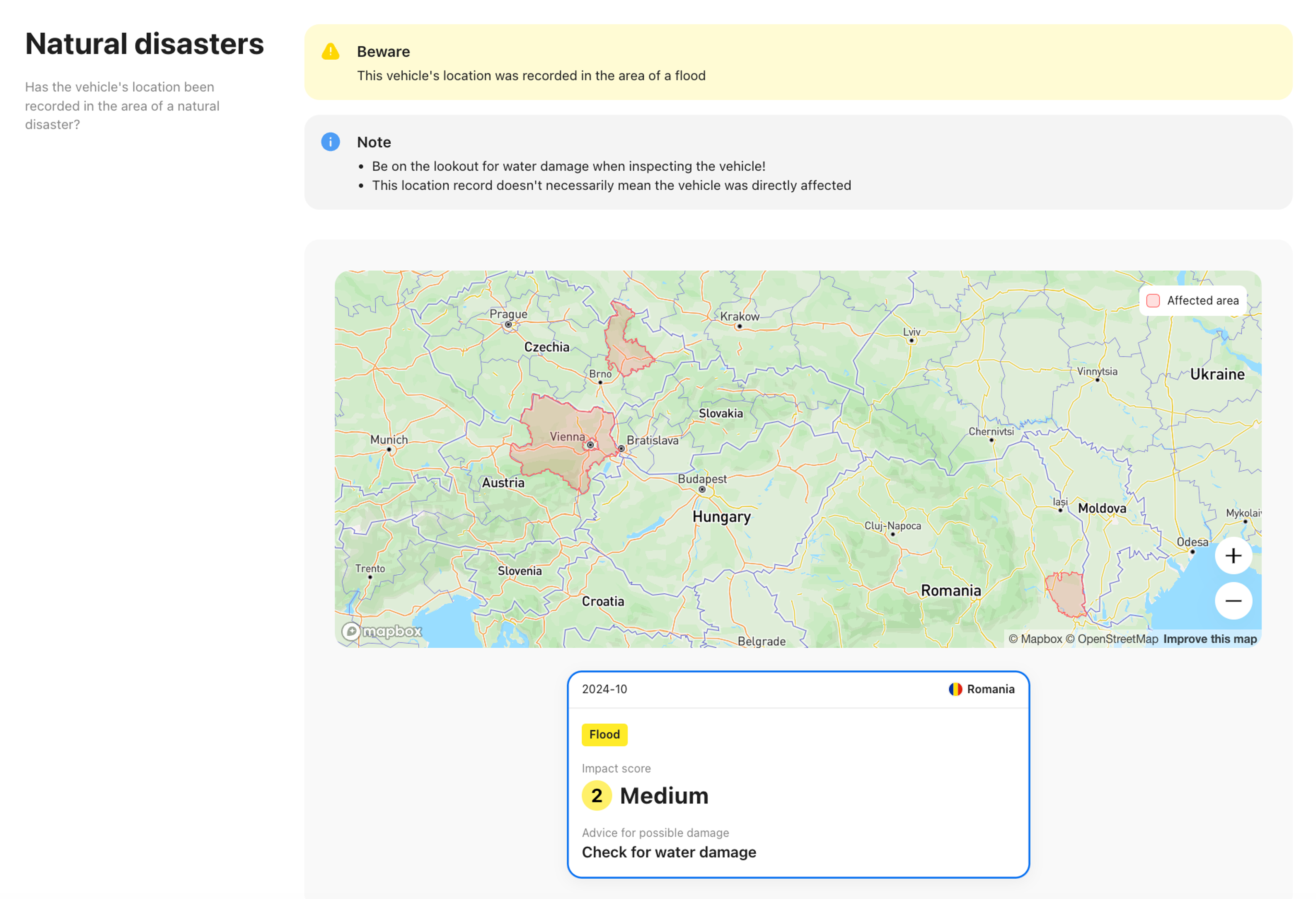 If the vehicle was located in an area impacted by flooding, you may learn this through our Natural disasters feature. While this feature doesn’t necessarily imply the car was affected, it could suggest when a thorough water damage check is necessary.