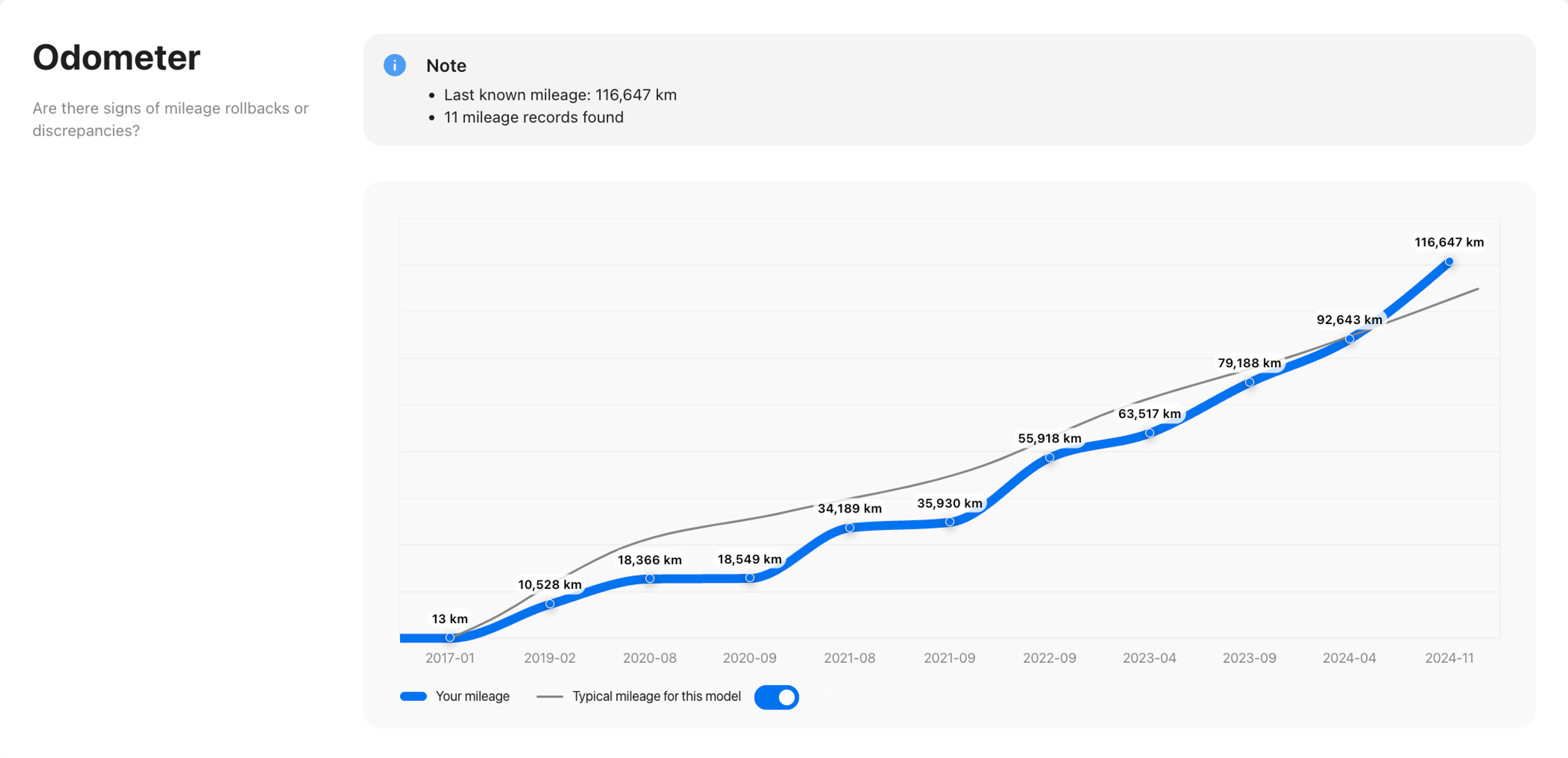 We try not only to provide customers with basic information about a car but also share our insights. Under the Odometer section, you can compare the vehicle’s mileage with the typical mileage of that model. For example, cargo vans typically have high mileage. And if the one you’re willing to buy has much lower mileage, this should raise your suspicion.