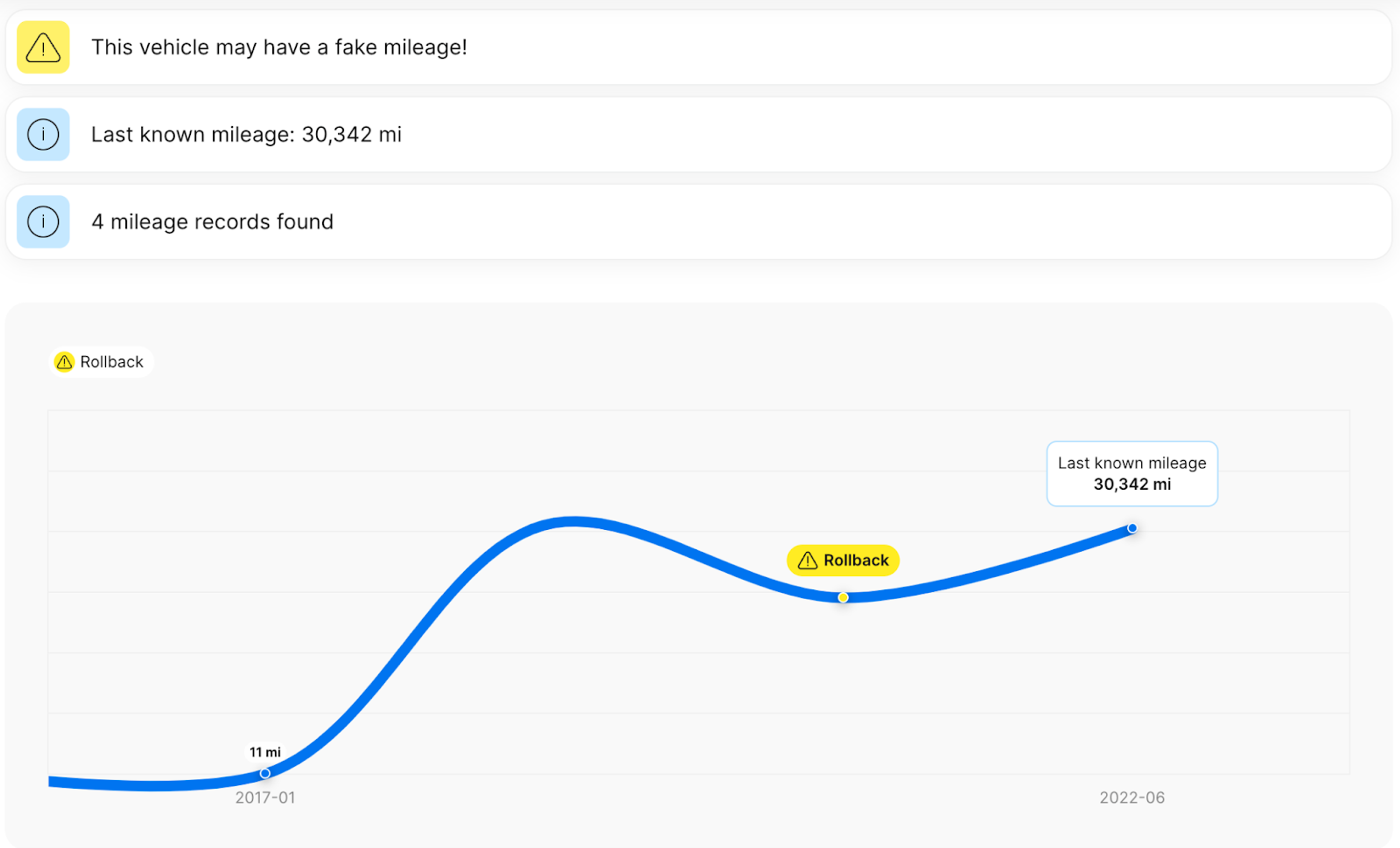 For instance, our vehicle history report provides a detailed overview using data collected from over 900 databases. By checking a vehicle’s VIN, you can learn about its damages, mileage rollbacks, ownership changes, maintenance, safety recalls, and more. If the seller is hiding something about their car, a history report is a good way to reveal this.