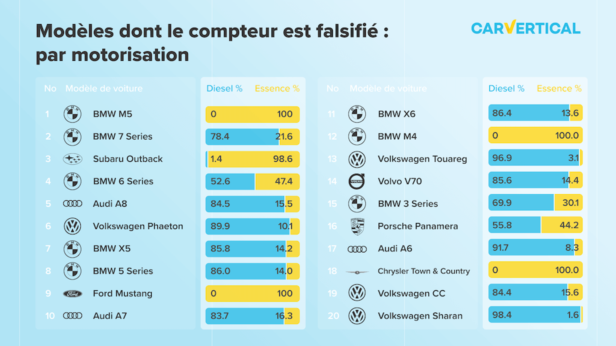 Sur des modèles comme la BMW série 6, la proportion diesel-essence est quasiment identique, car les moteurs essence sont plus bien plus populaires pour ces catégories de véhicules. Dans certains cas, on ne retrouve aucun diesel, car la motorisation essence est la seule disponible, c’est le cas par exemple pour la BMW M5 ou encore la Ford Mustang.
