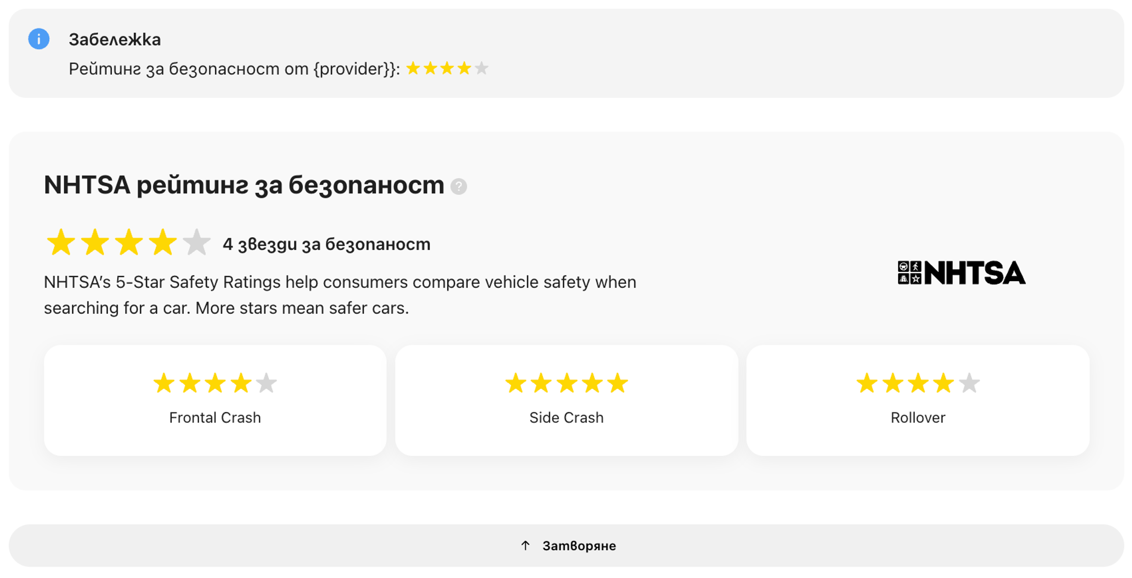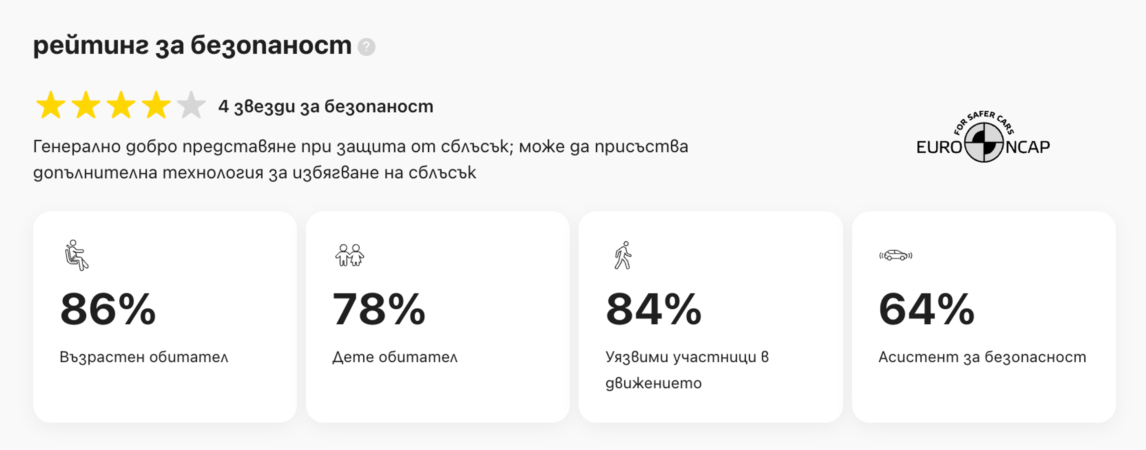 - Цялостна оценка за безопасността на превозното средство (от 1 до 5 звезди)