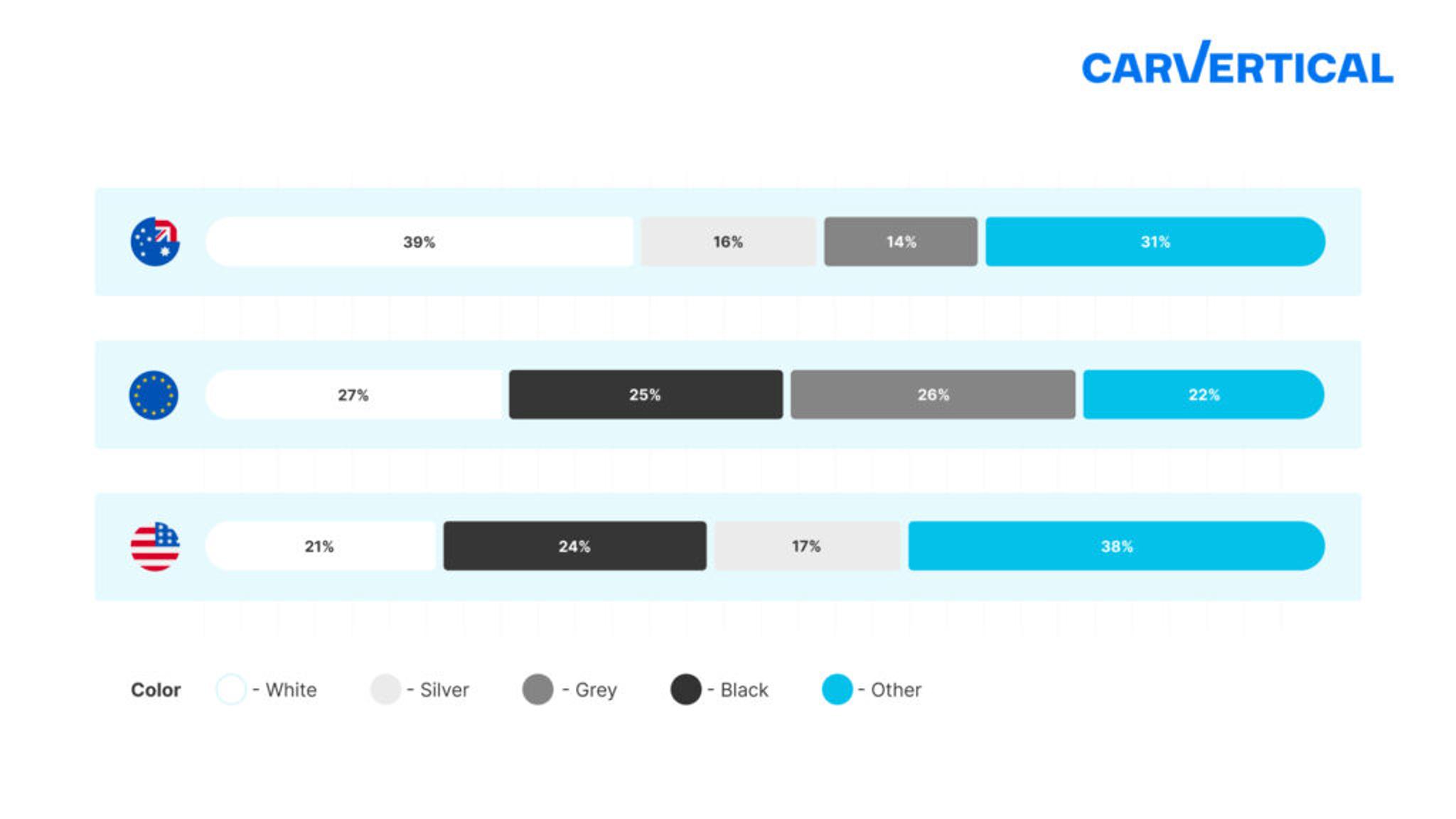 Our study has revealed that white is the most popular color in Australia (39.1% of the total vehicle fleet) and the EU (26.8%). Australians also adore silver (15.9%) and gray cars (14%). Europeans prefer gray even more (25.9%), followed by black vehicles (24.5%).