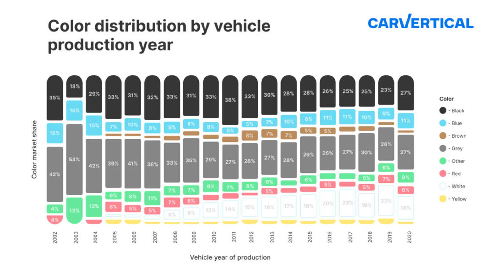 Vehicle interior and exterior trends have changed significantly throughout the years. And so have the most popular car colors. For instance, 42% of cars manufactured in 2002 and checked on the carVertical platform were gray or silver. However, there were not so many white vehicles at that time.