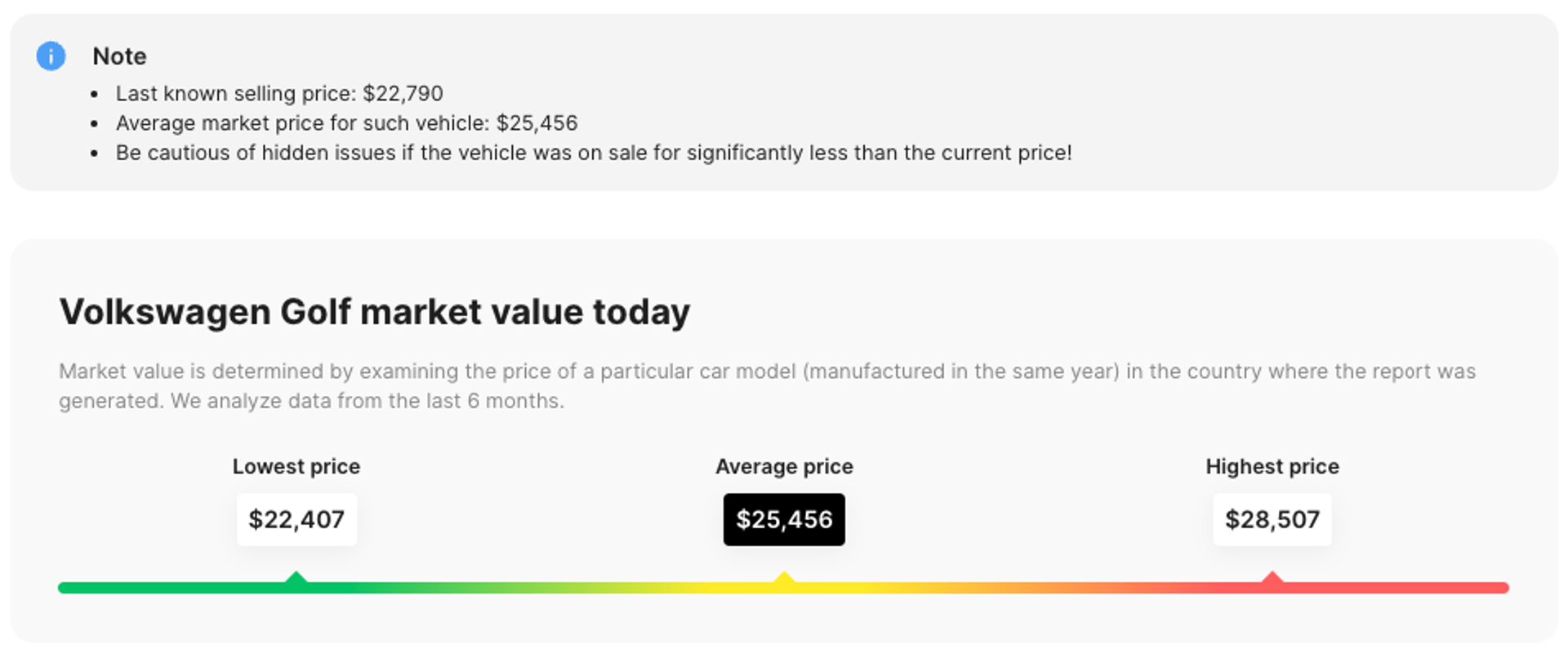 - Use online valuation tools. Online price guides allow you to input information about a vehicle and get an estimate of its value. You can also get a carVertical report and check the Market value section to see an approximate value range.