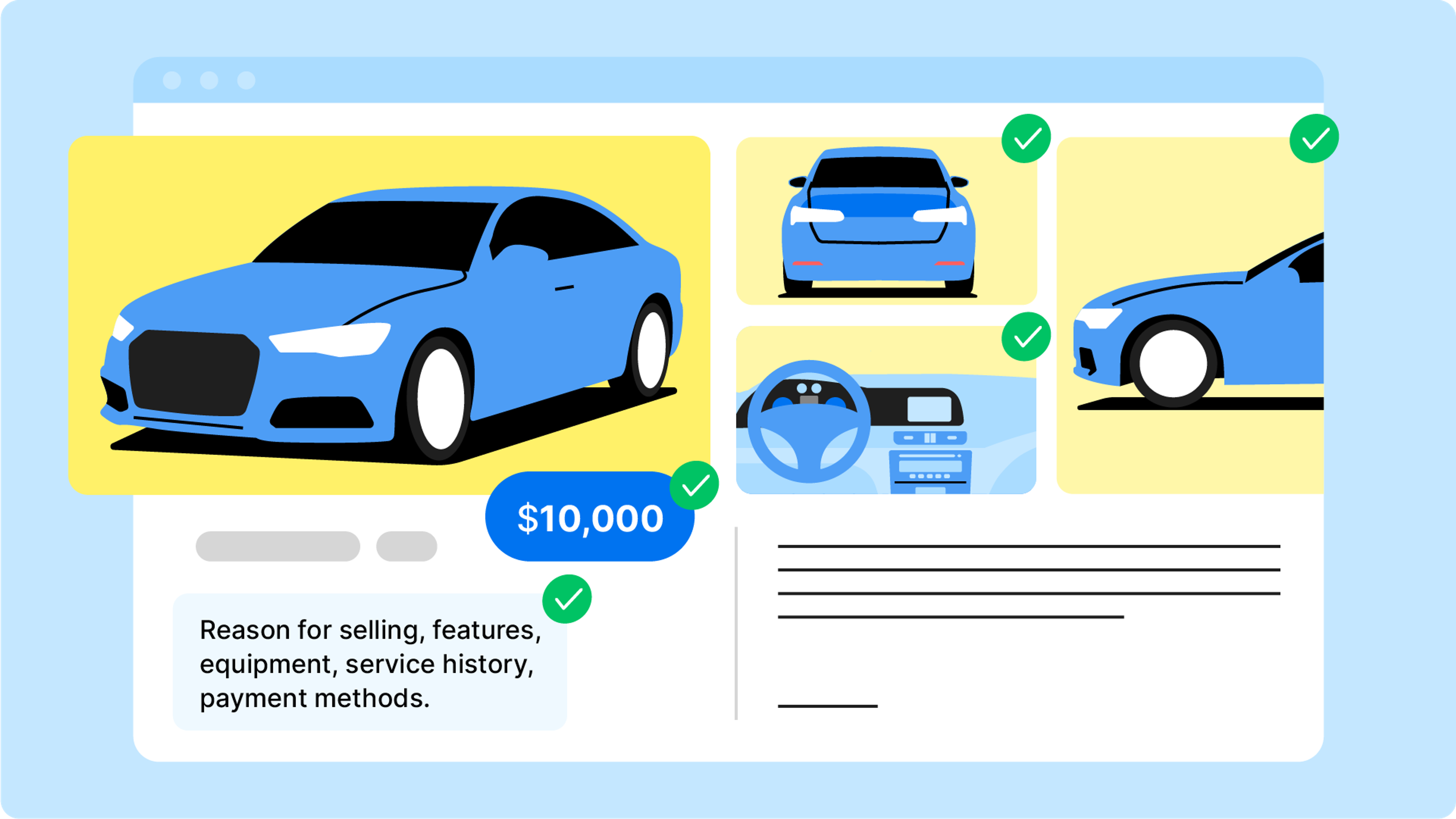 - Include high-quality images. Never make ads without images – most people will ignore them completely. Take some quality photos of the car's exterior and interior while avoiding direct sunlight and dim environments.