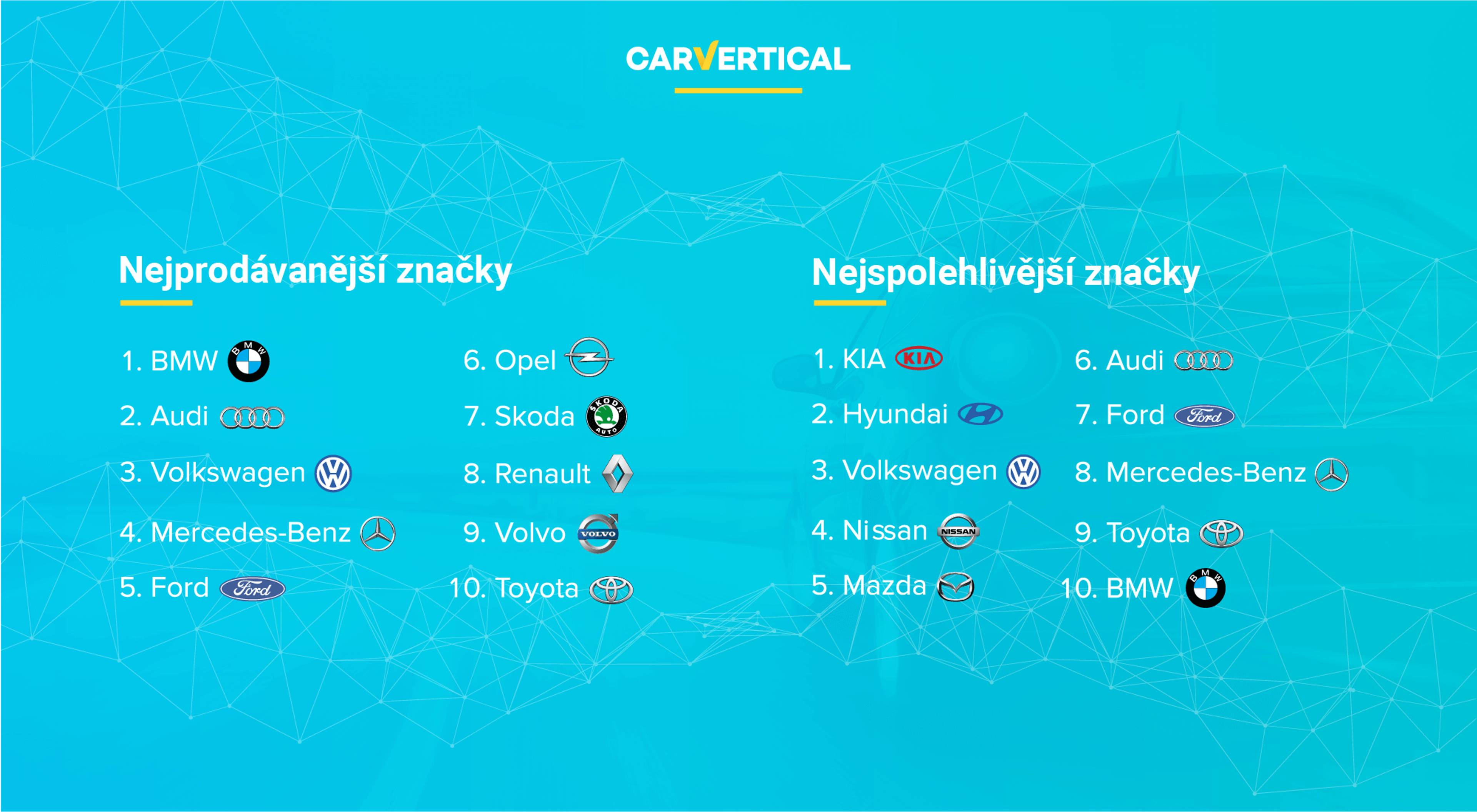 Sestavili jsme seznam nejspolehlivějších značek automobilů pomocí výpovědního kritéria - poškození. Zjištění jsou založena na přehledech o historii vozidel společnosti carVertical. Žebříčky ojetých vozů, které se chystáte vidět, jsou odvozeny z procenta poškozených vozů každé značky z celkového počtu analyzovaných vozů značky. Začněme seznamem nejspolehlivějších značek ojetých automobilů.