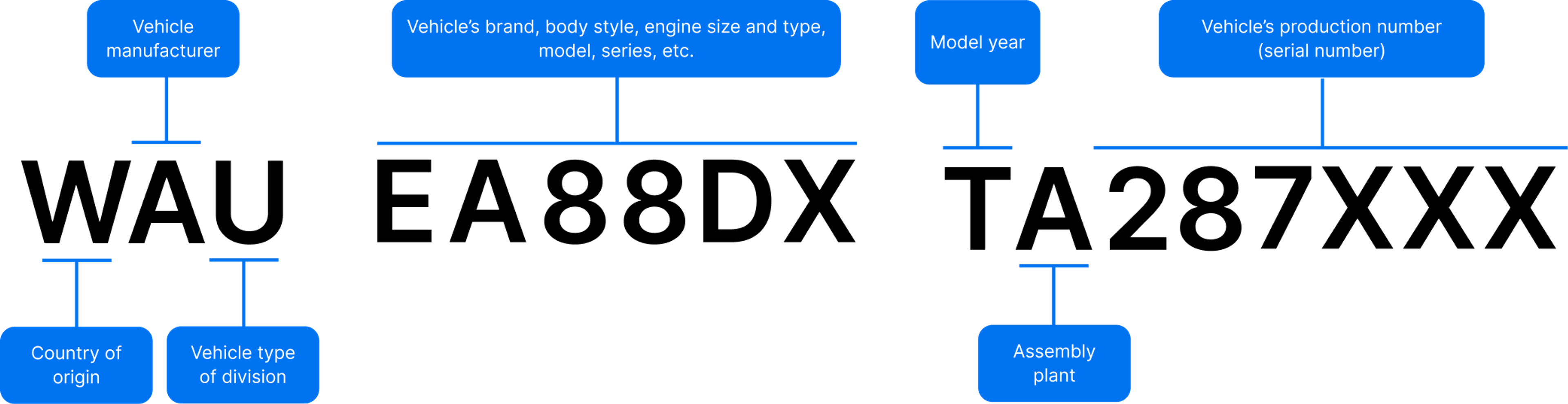 Der Audi VIN-Decoder ist ein Online-Tool zur Entschlüsselung der Fahrgestellnummer eines Audi. Jede Zeichengruppe in der VIN enthält fahrzeugspezifische Informationen, die in ihrer Gesamtheit eine eindeutige Identifizierung ermöglichen.