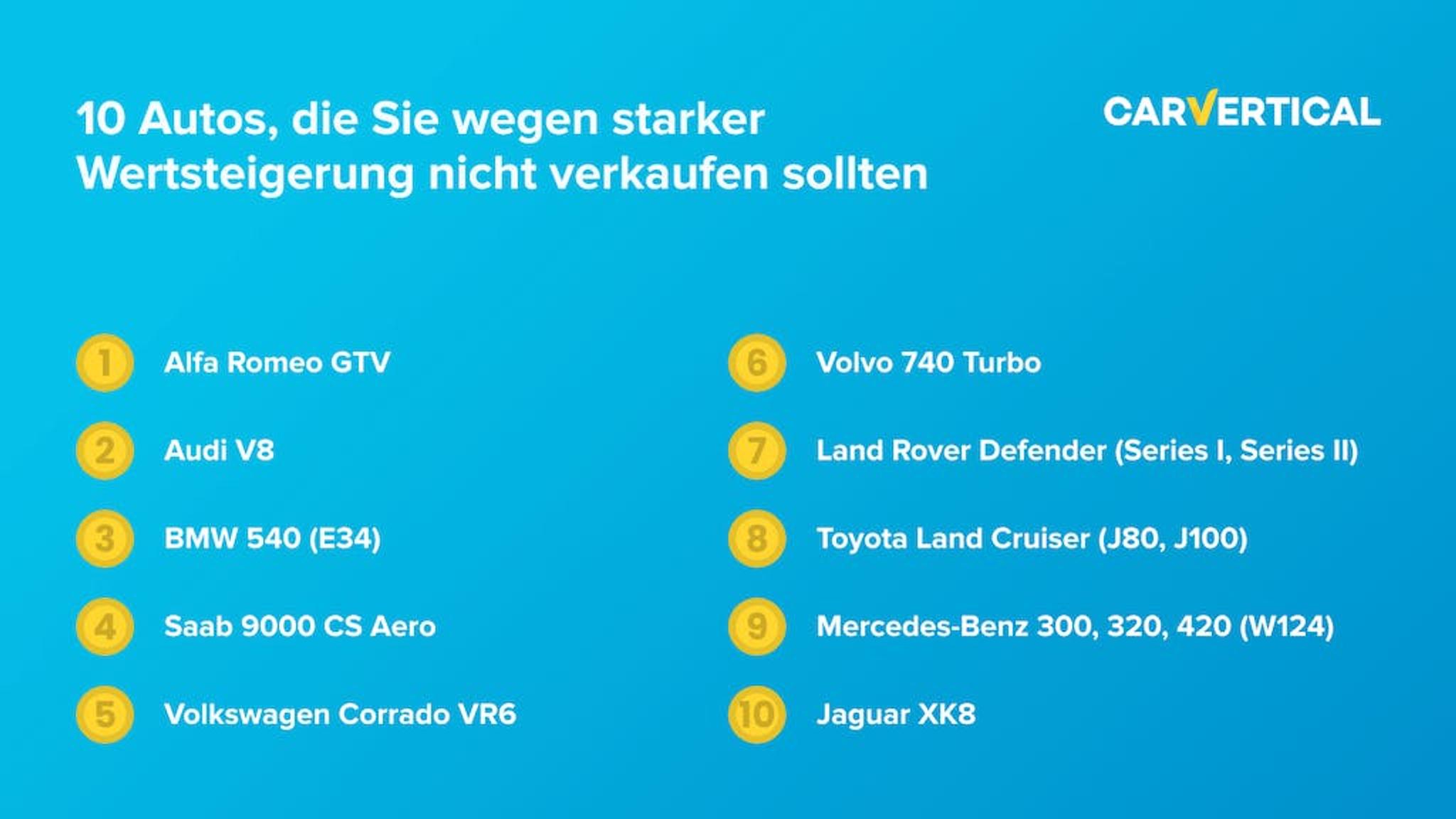 Die Experten vom Fahrzeug-Historienregister carVertical haben den Automobilmarkt analysiert und eine Liste von 10 Autos erstellt, die Sie aufgrund ihrer erheblichen Wertsteigerung nicht verkaufen sollten. Sie haben dazu auch die carVertical Datenbank untersucht, die Tausende von Autohistorien enthält, und einige Statistiken über diese besonderen Modelle herausgefunden. Hier ist die entstandene Liste: