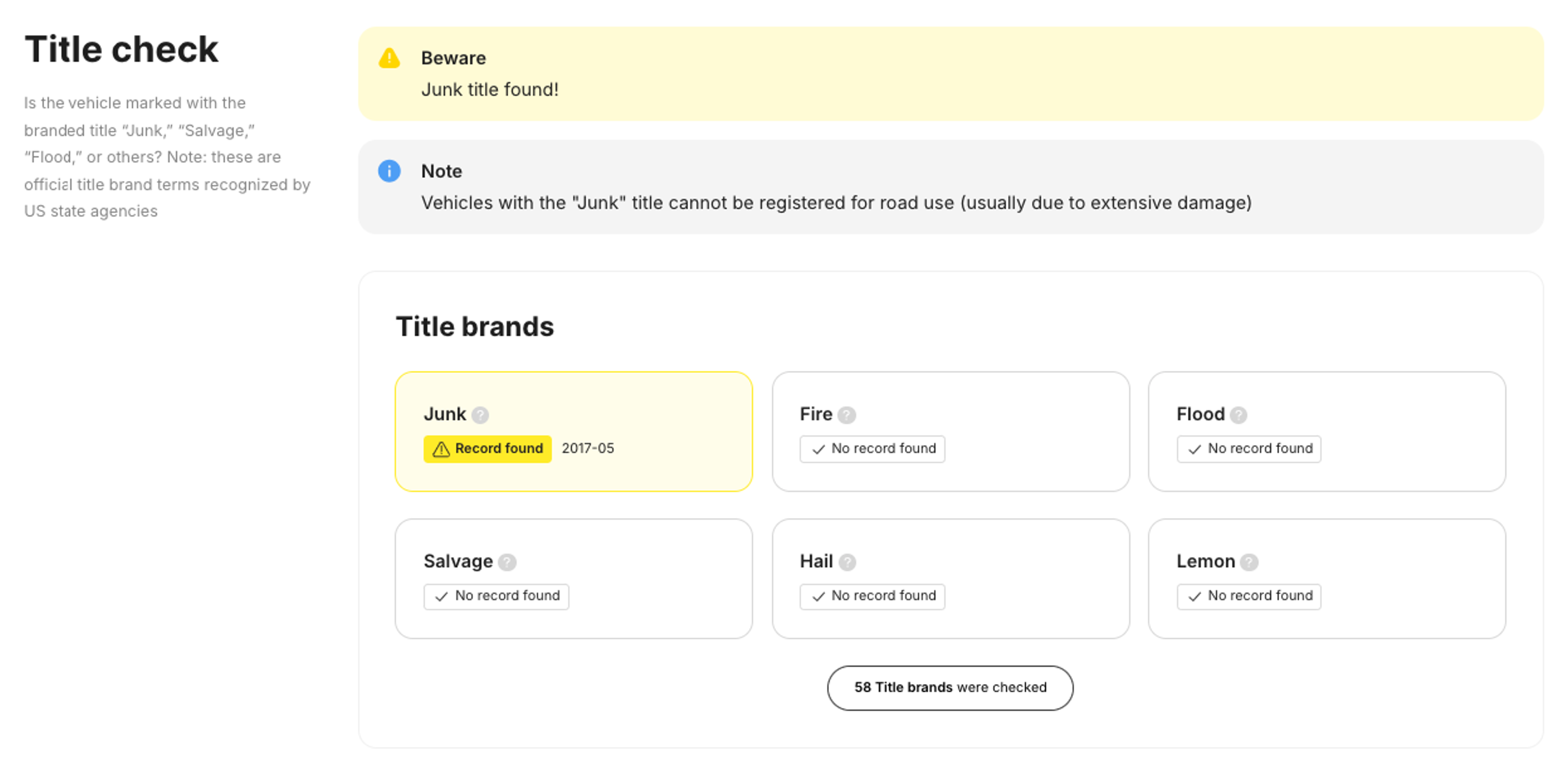 Our history check combines detailed information from government and insurance databases to provide you with a history report, including: