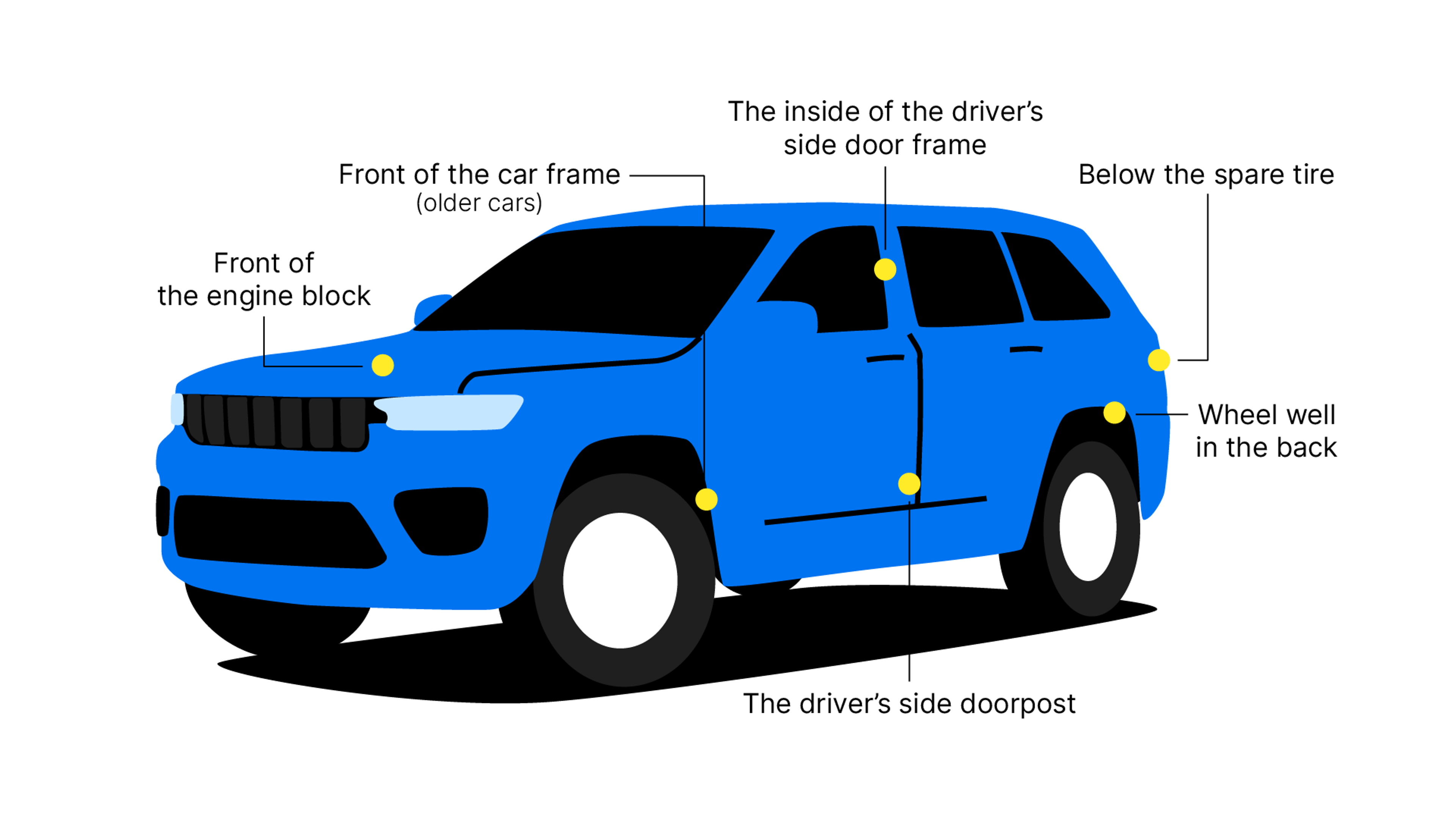 - The driver’s side doorpost. Open the door and look near the latching point, not far from the seatbelt return.