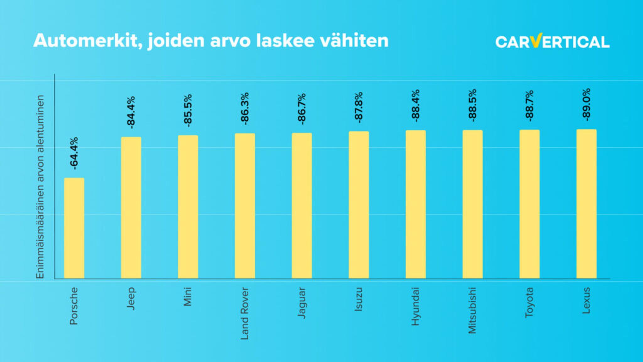 Porsche ja MINI maksavat vähiten täytettyään 15 vuotta. Kun ne saavuttavat tämän iän, niiden arvo alkaa jälleen kasvaa. Suzuki, Isuzu, Kia ja Dacia ovat kirjon toisella puolella – niiden arvo on pienimmillään 30-vuotiaana.