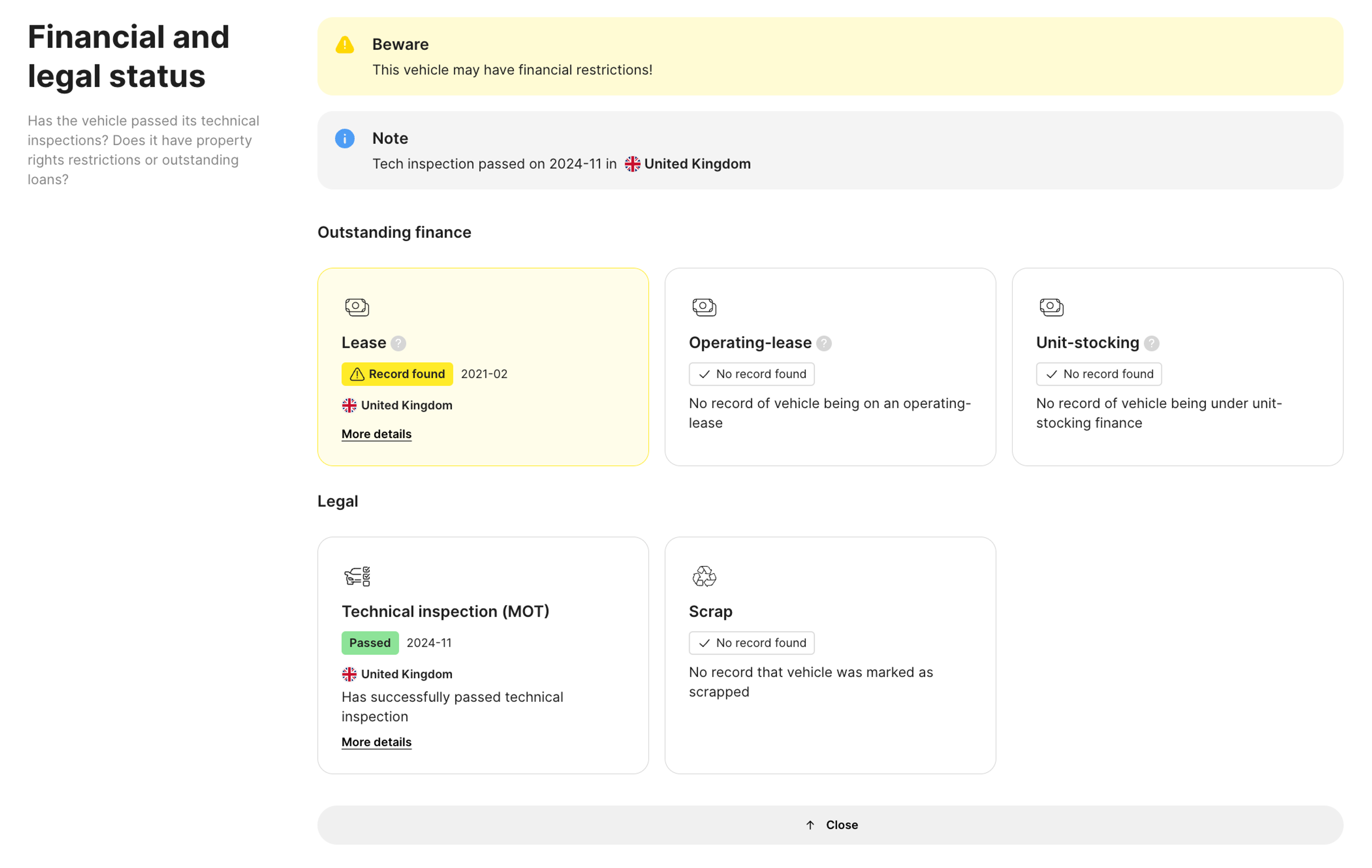 Additionally, in the Legal part of this section, you can see whether the vehicle has passed technical inspections or if it’s marked as “scrapped.”