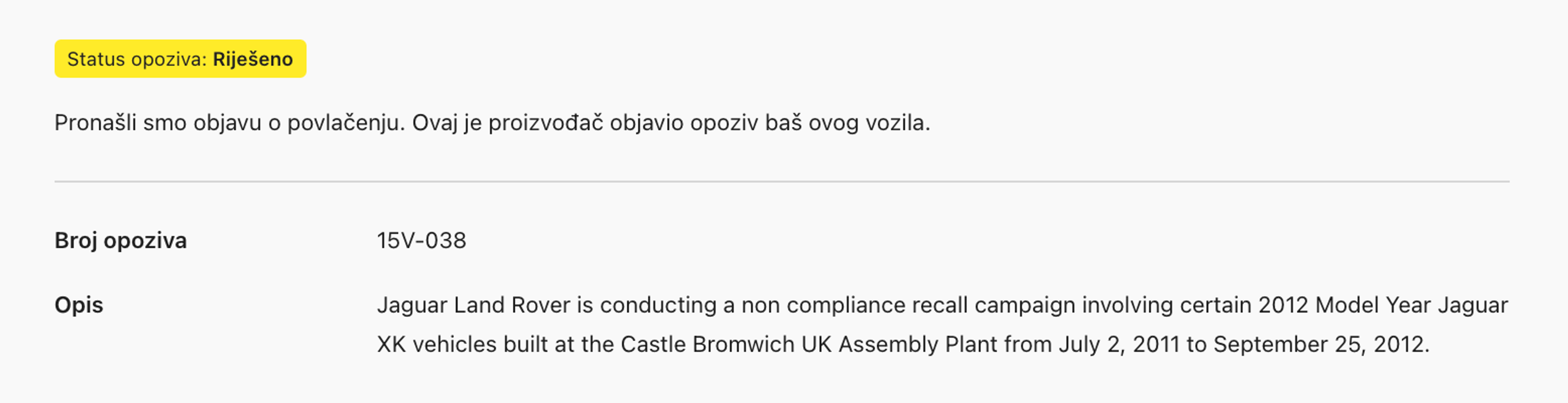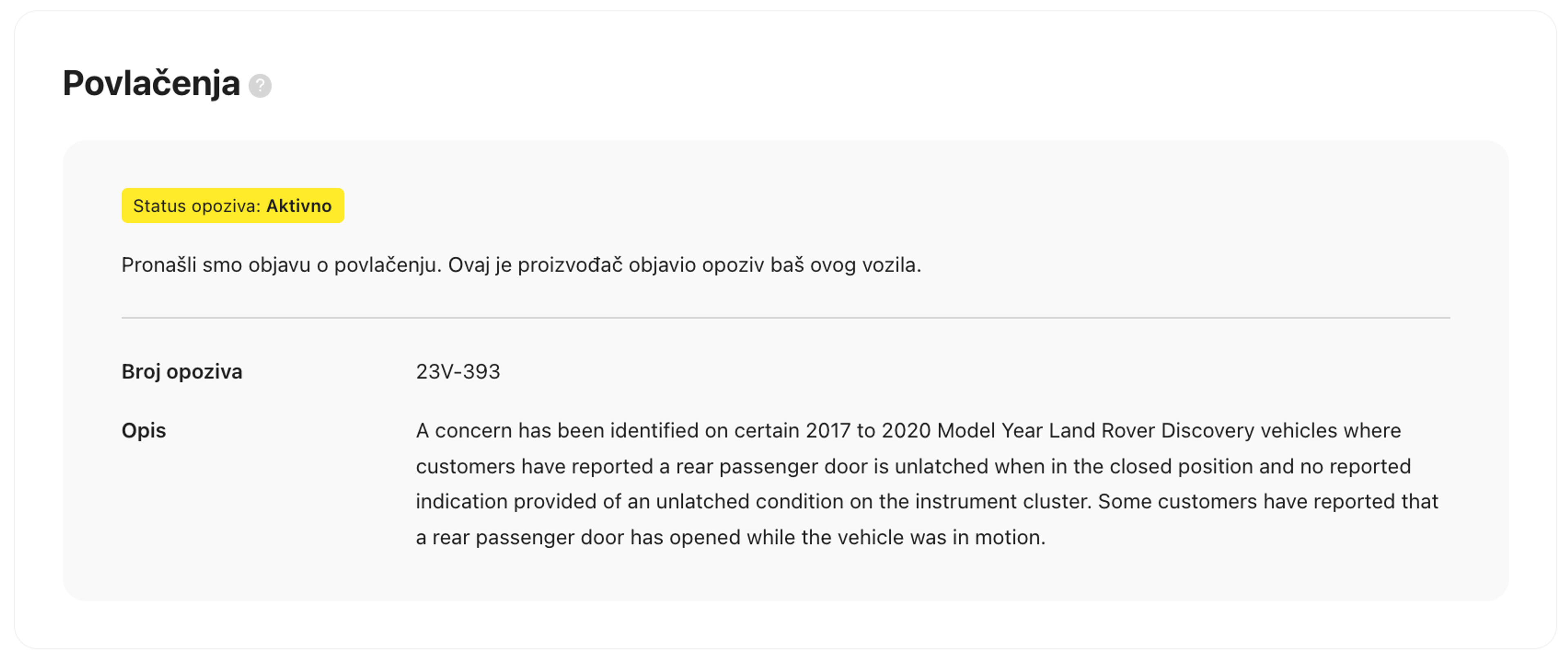 Osim toga, odjeljak Sigurnost u izvješću pružit će ti informacije o sigurnosnim povlačenjima automobila s tržišta, ako ih ima. Pored svakog povlačenja vidjet ćeš njegov status (Aktivno, Riješeno ili Nepoznato) i druge dostupne informacije, kao što su kada je najavljeno, broj povlačenja, rizik i slično.