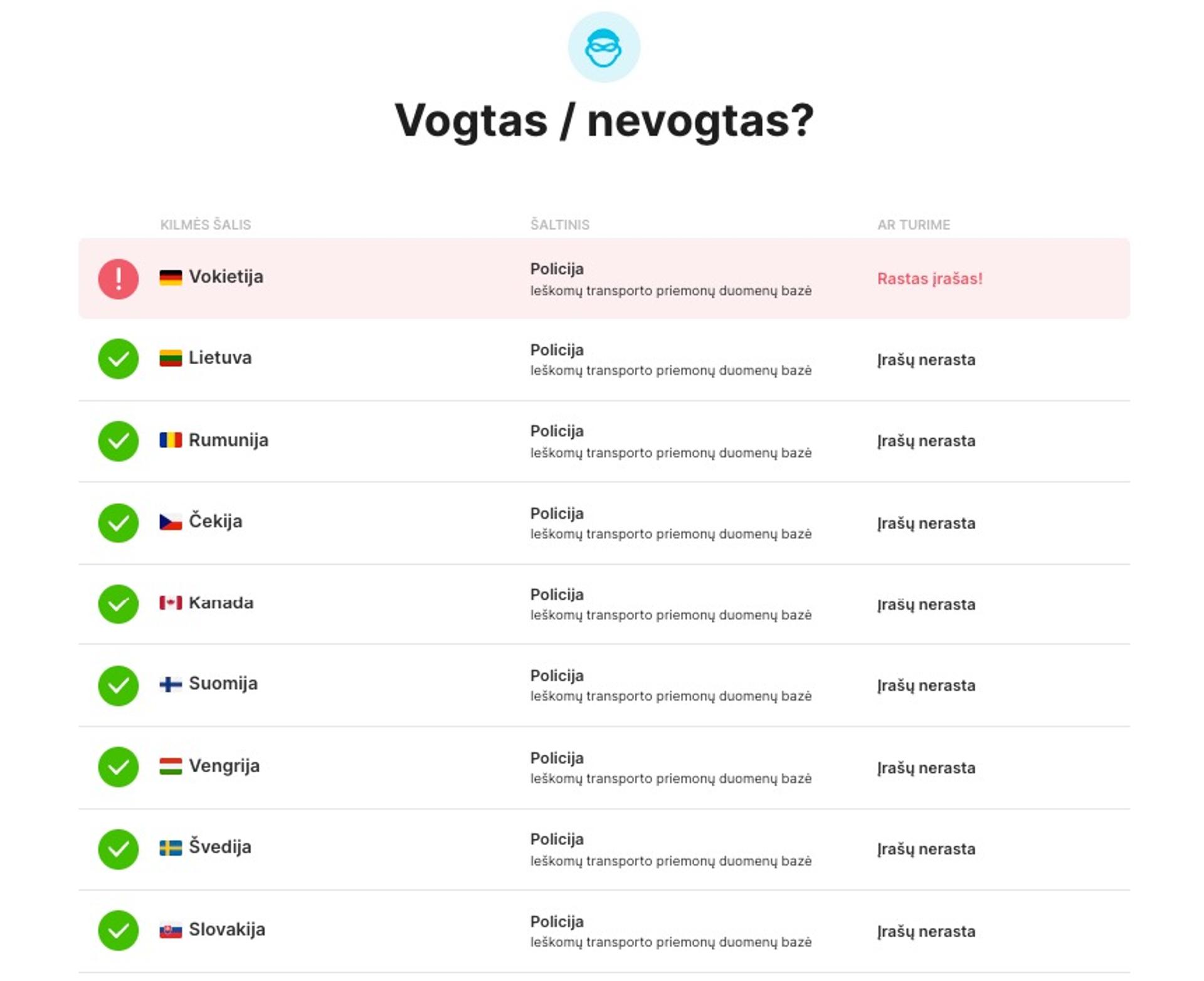 Naudotų automobilių rinkoje pasitaiko ir vogtų automobilių. Vieni vogtus automobilius parduoda dalimis, kiti bando laimę talpindami juos į skelbimų portalus. Bandydami įregistruoti vogtą automobilį, susidursite su didžiulėmis problemomis ir galite netgi atsidurti teisme. Mūsų ataskaitose pateikiami duomenys iš įvairių šalių policijos registrų, todėl prieš renkantis naują transporto priemonę, nepamirškite patikrinti jos istorijos.