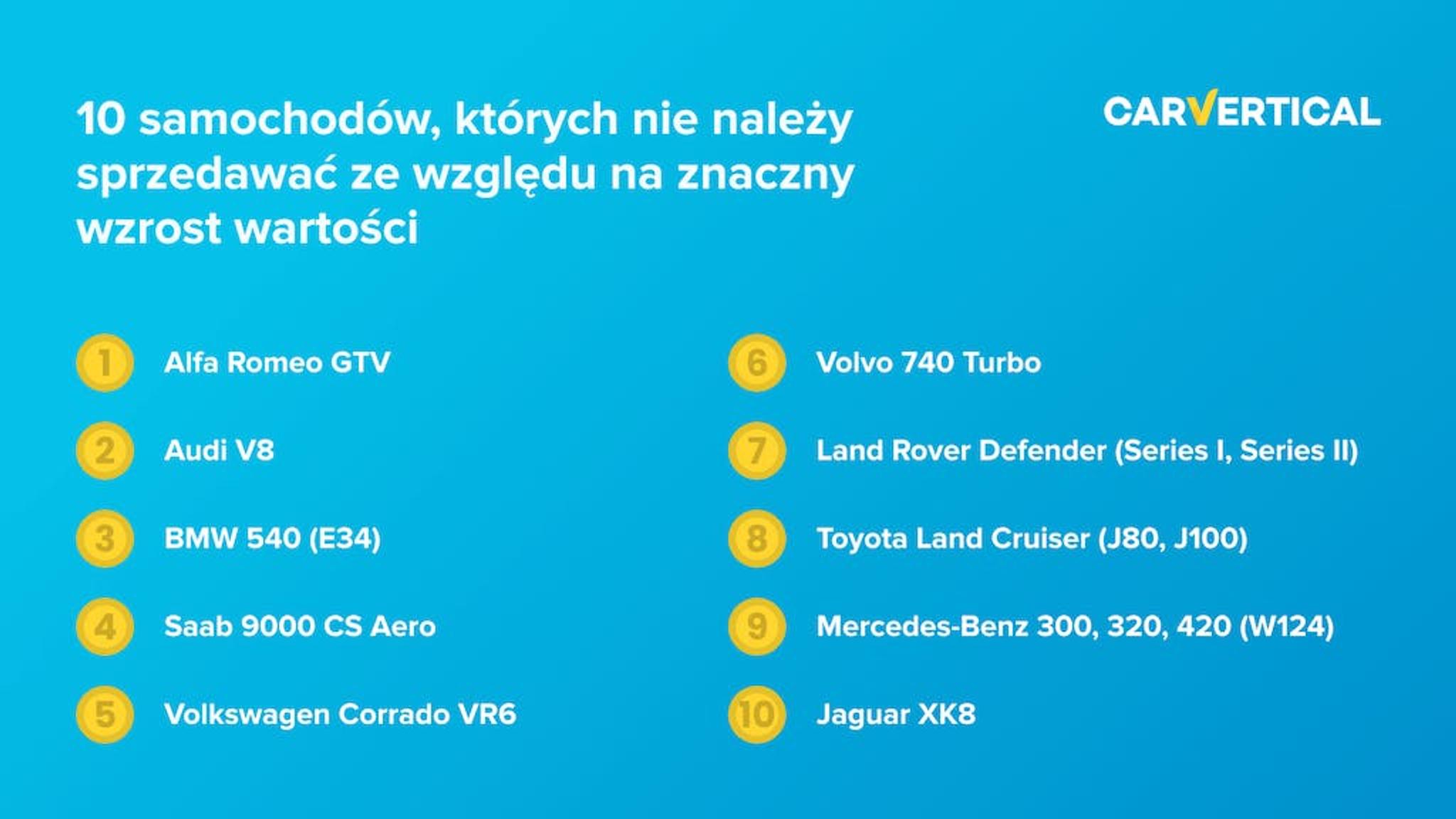 Eksperci z zakresu rejestru historii samochodów carVertical przeanalizowali rynek motoryzacyjny i przygotowali listę 10 samochodów, których nie należy sprzedawać ze względu na znaczny wzrost ich wartości. Wykorzystali oni także swoją bazę danych carVertical, która zawiera tysiące raportów historii samochodów, aby przeanalizować niektóre statystyki dotyczące konkretnych modeli.