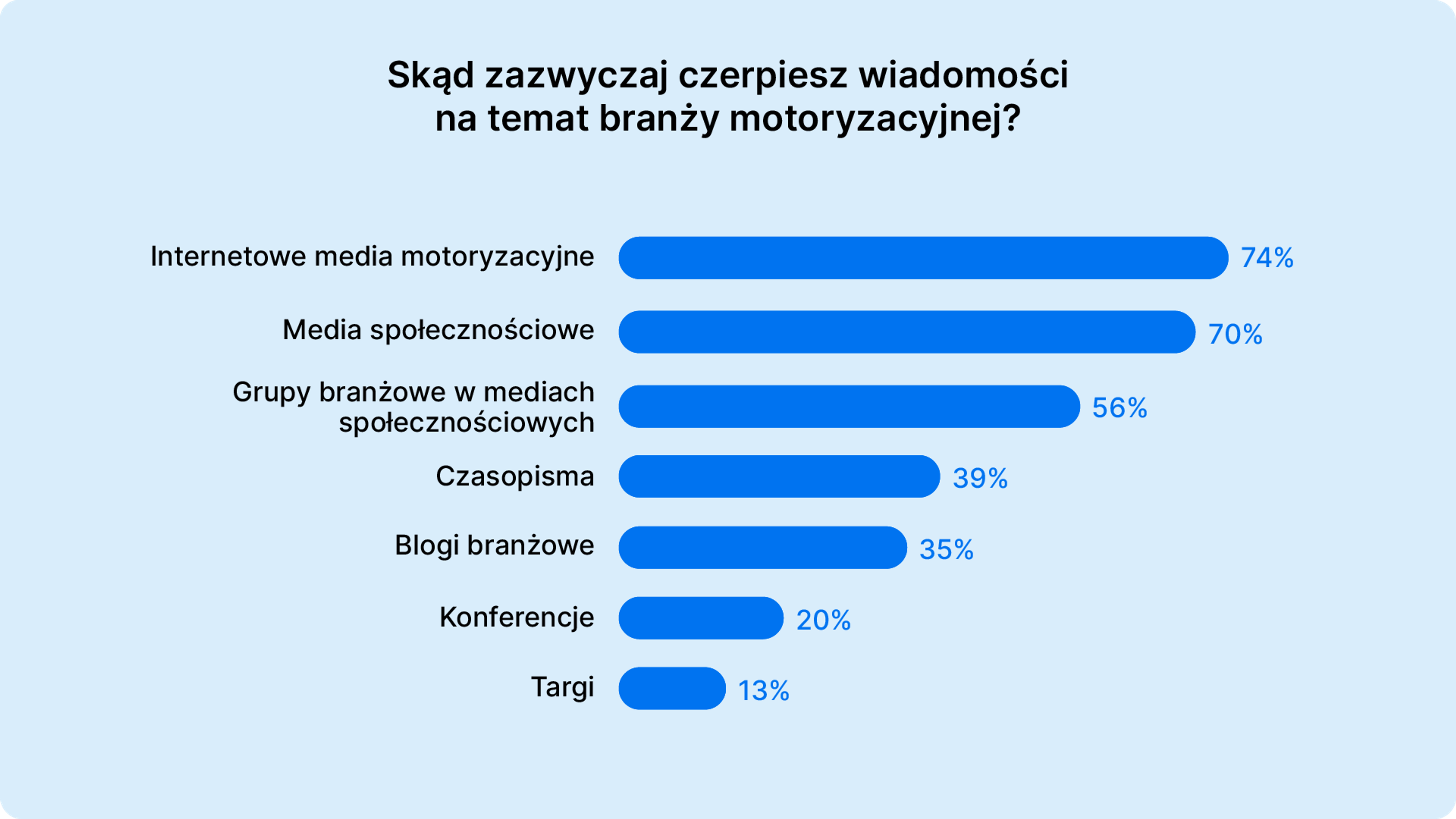 Większość ankietowanych dealerów w Polsce korzysta z internetowych mediów motoryzacyjnych (74%) i mediów społecznościowych (70%) jako głównych źródeł wiadomości i trendów branżowych. Jednocześnie 35% dealerów od czasu do czasu odwiedza również blogi sprzedawców internetowych. Jako główne platformy Polacy wymieniają Auto Świat, TVN Turbo i Otomoto.