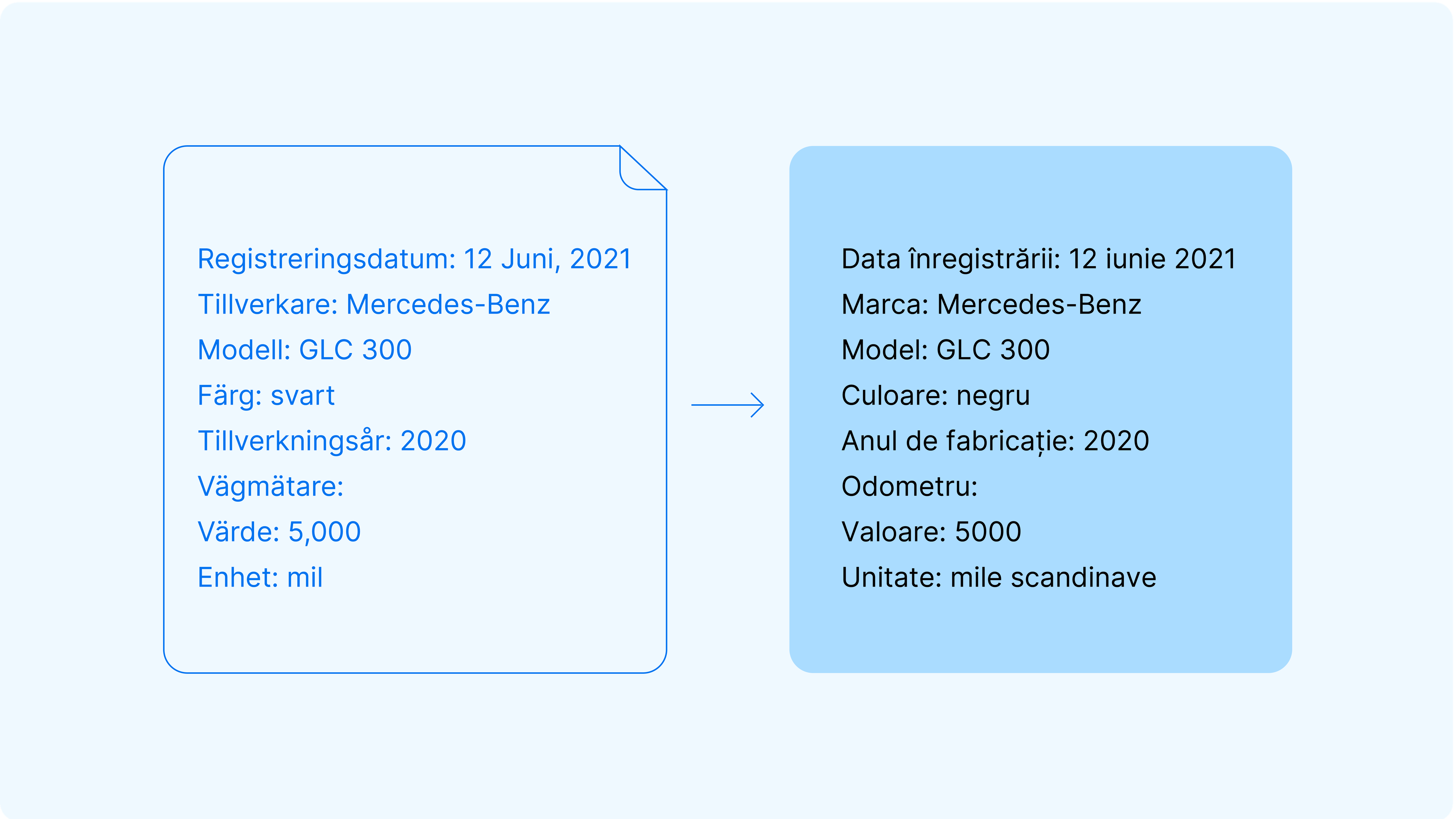 Imaginează-ți că primim un document suedez pentru un Mercedes-Benz GLC 300, negru, cu 5.000 de mile scandinave (50.000 km) pe odometru, datat 12 iunie 2021. Înainte de a putea folosi aceste informații, trebuie să: