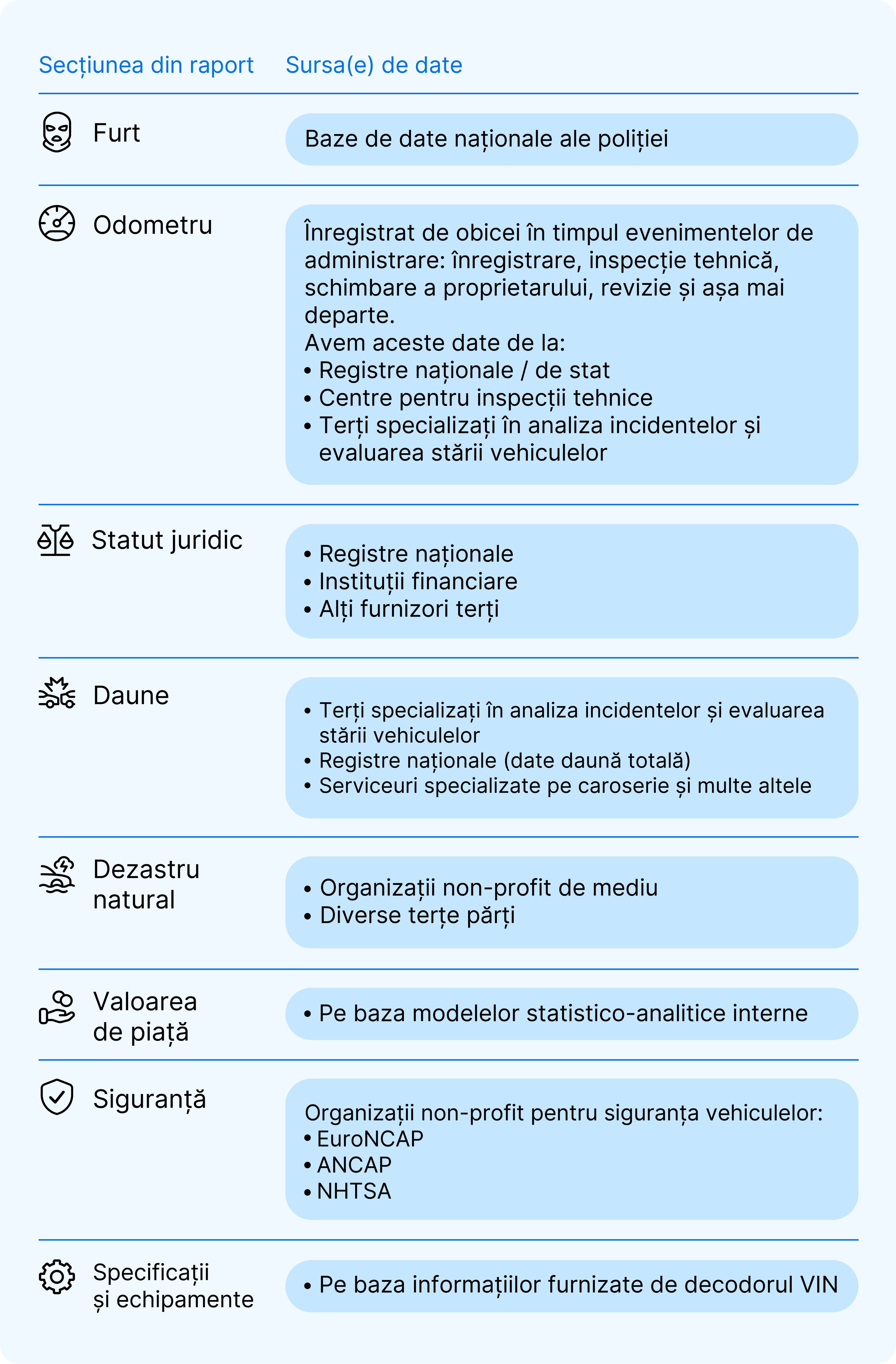• Același tip de informație poate proveni din tipuri diferite de surse. De exemplu, înregistrările de kilometraj (chiar și aceeași înregistrare) pot proveni dintr-o vizită la service pentru revizie, o înregistrare a poliției sau din altă parte.