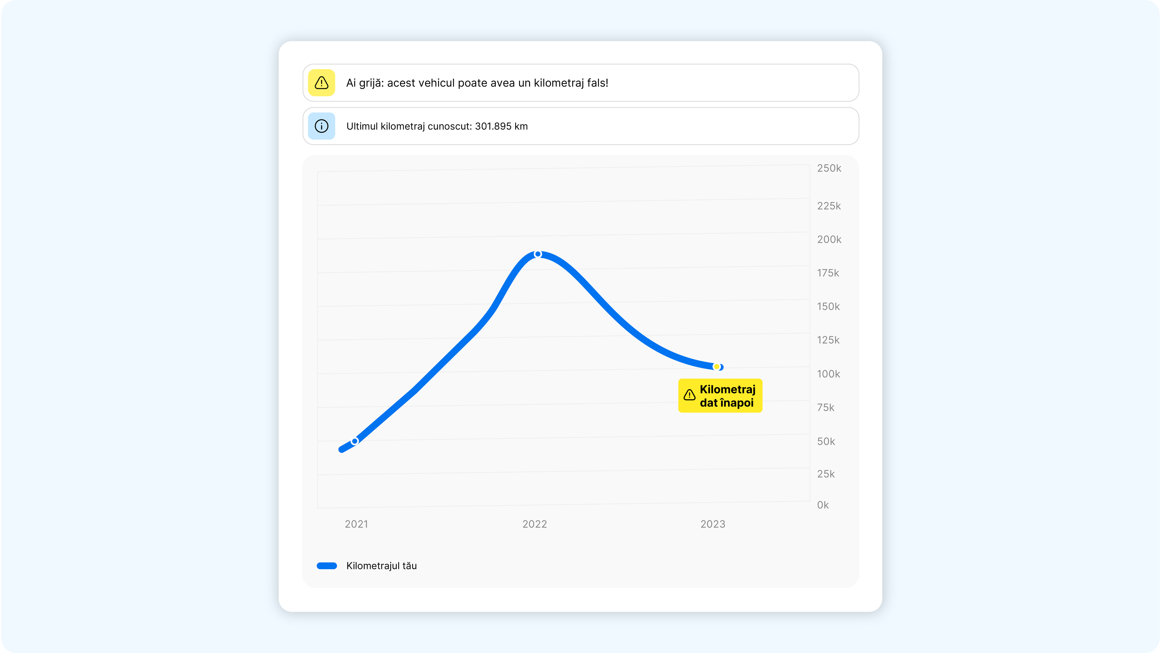 În acest punct toate informațiile pe care le-am adunat, curățat, sortat și îmbogățit sunt folosite pentru a genera un raport carVertical. Să revenim la Mercedesul nostru pentru un ultim exemplu. Iată cum ar putea arăta secțiunea Odometru: