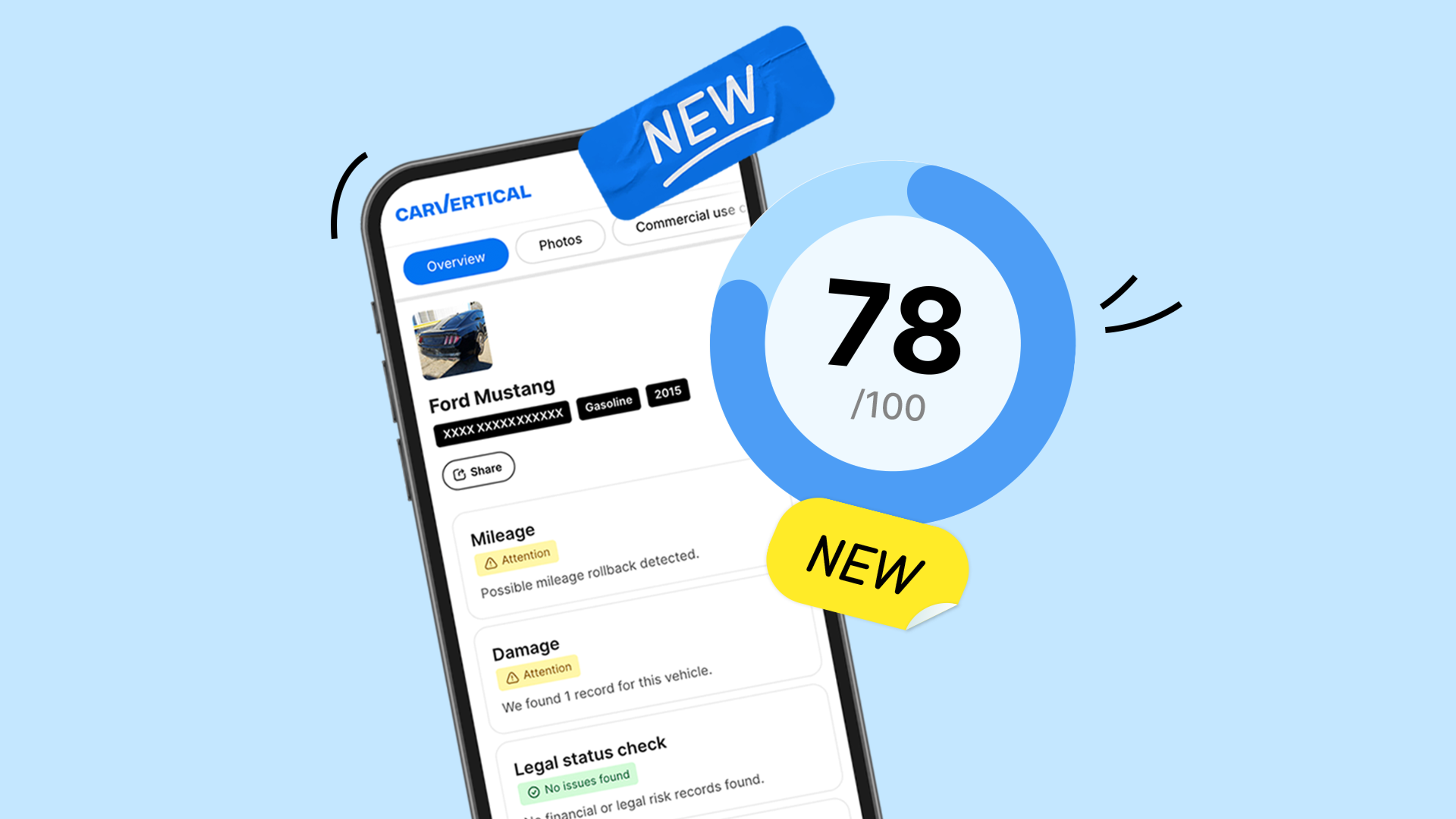 Odteď uvidíte skóre v záhlaví svého přehledu carVertical, po boku dalších informací o vozidle. Abychom zajistili maximální spolehlivost, zobrazujeme skóre pouze u těch automobilů, k nimž máme k dispozici dostatek ověřených dat.