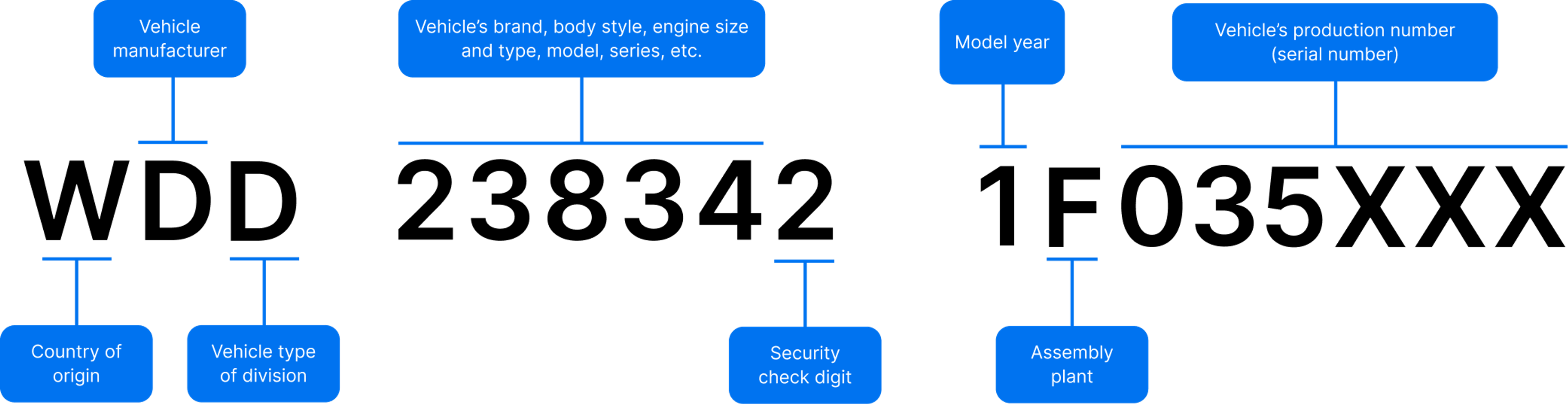 Die VIN bei Mercedes besteht aus mehreren Abschnitten mit insgesamt 17 Buchstaben und Zahlen. Der Aufbau gliedert sich wie folgt: