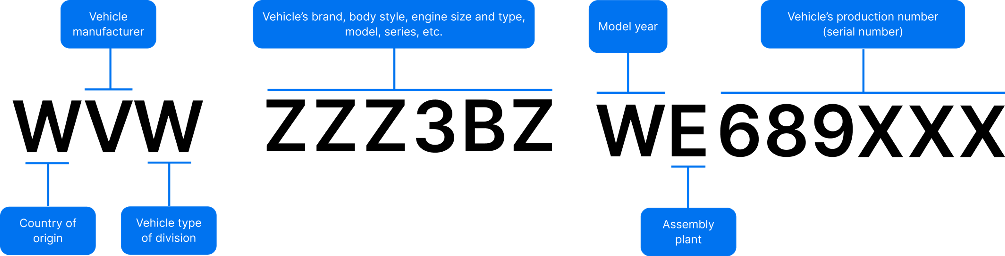 Die Buchstaben und Zahlen der Fahrzeug-Identifizierungsnummer sind in drei Abschnitte unterteilt: World Manufacturer Identifier (WMI), Vehicle Description Section (VDS) und Vehicle Identifier Section (VIS).
