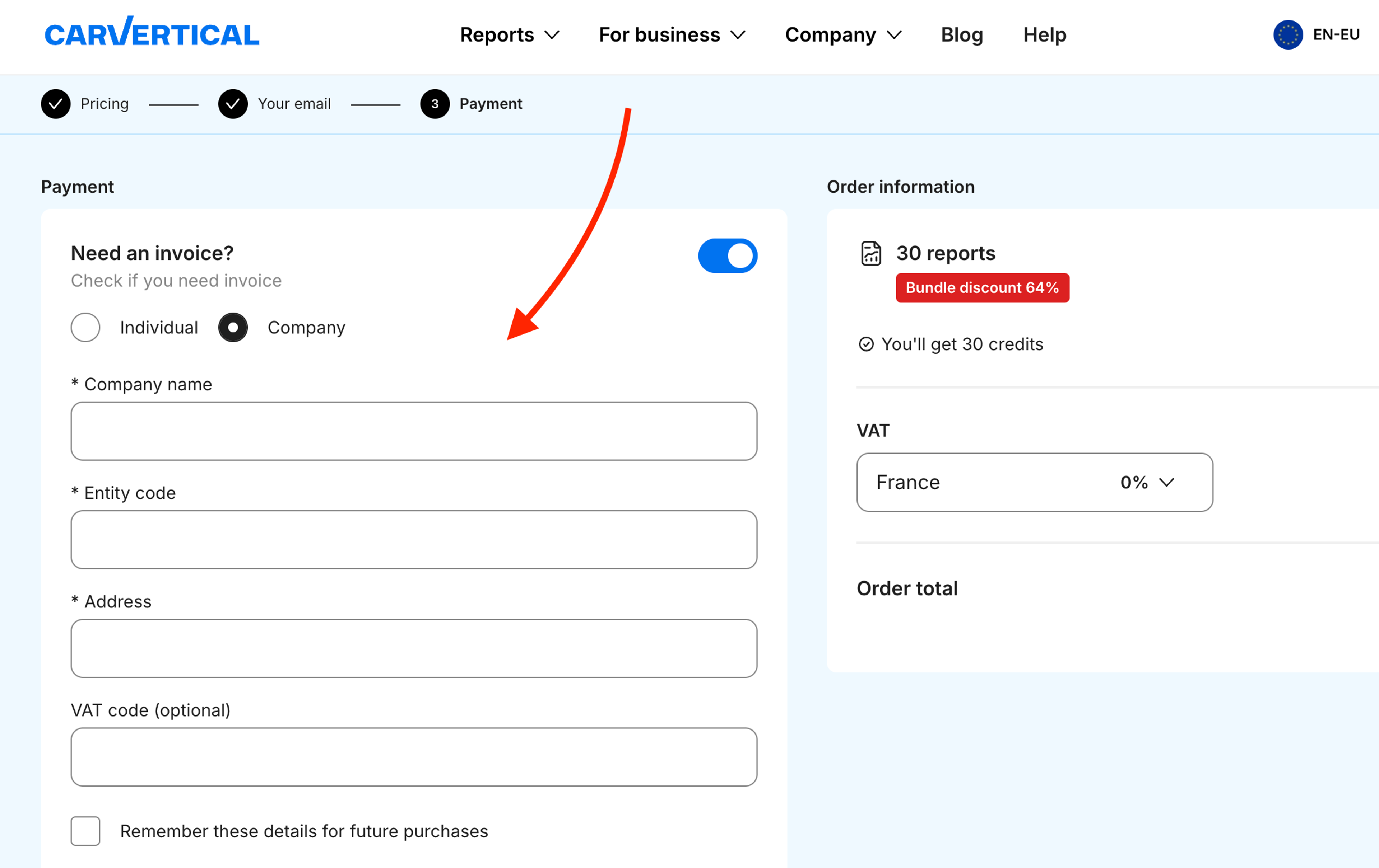 Note: Depending on your bank, the payment may take 1-2 working days to process. Once received, reports will be added to your carVertical account automatically.