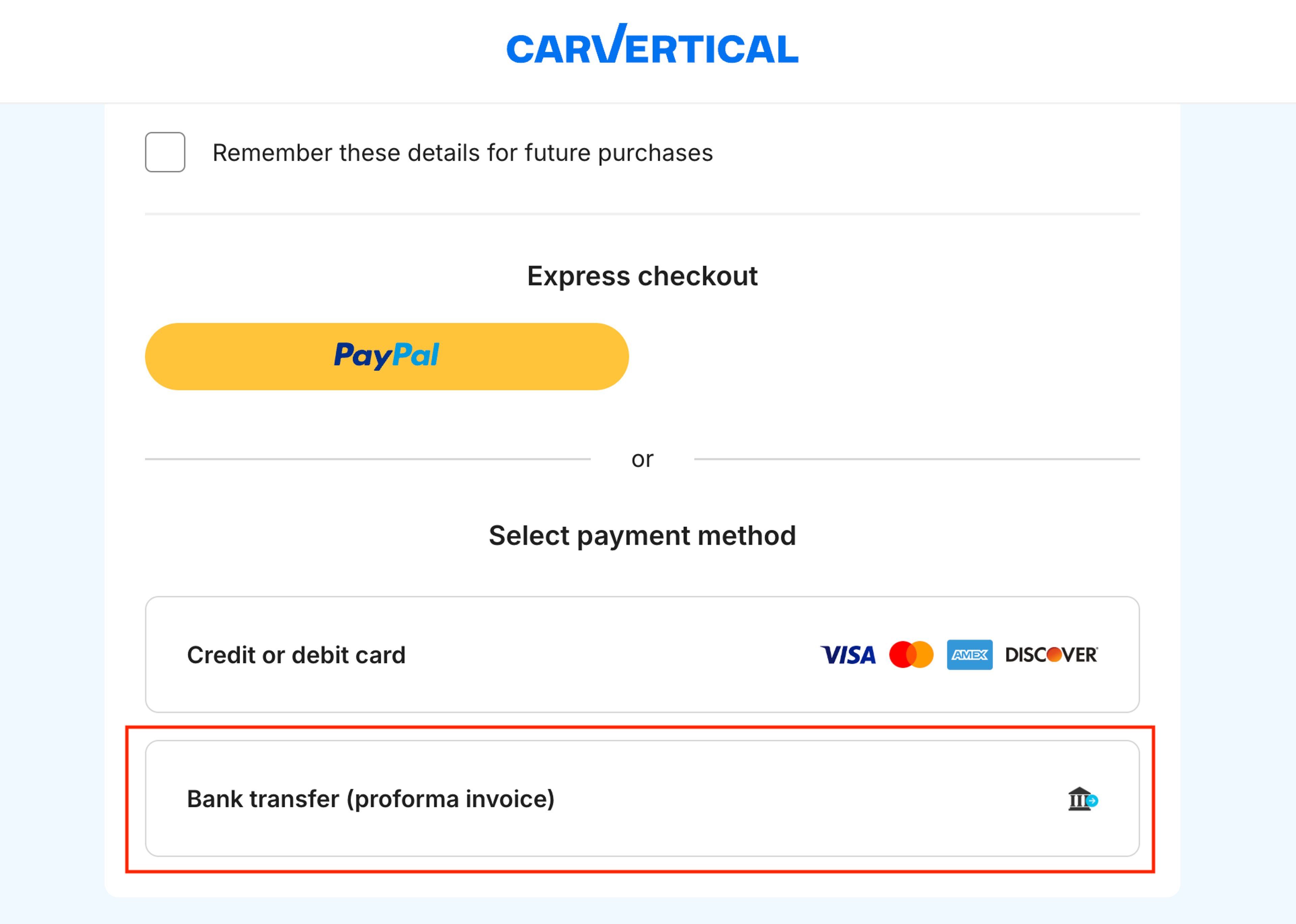 3. Once done, select Bank transfer (proforma invoice) as your payment method.