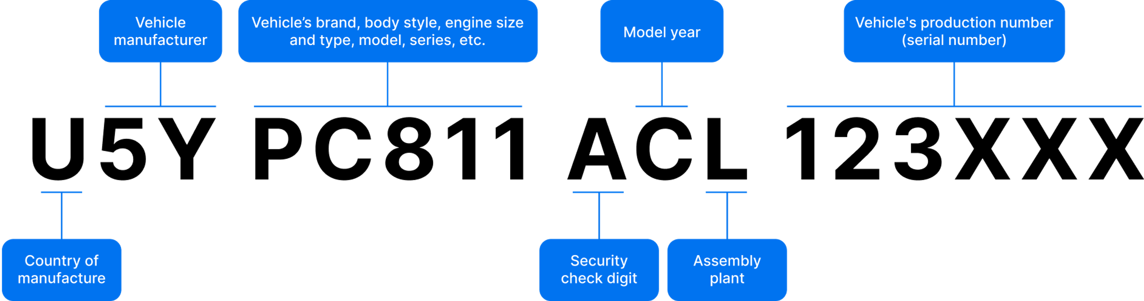 The second section (VDS) consists of 5 characters, revealing basic information about the car.