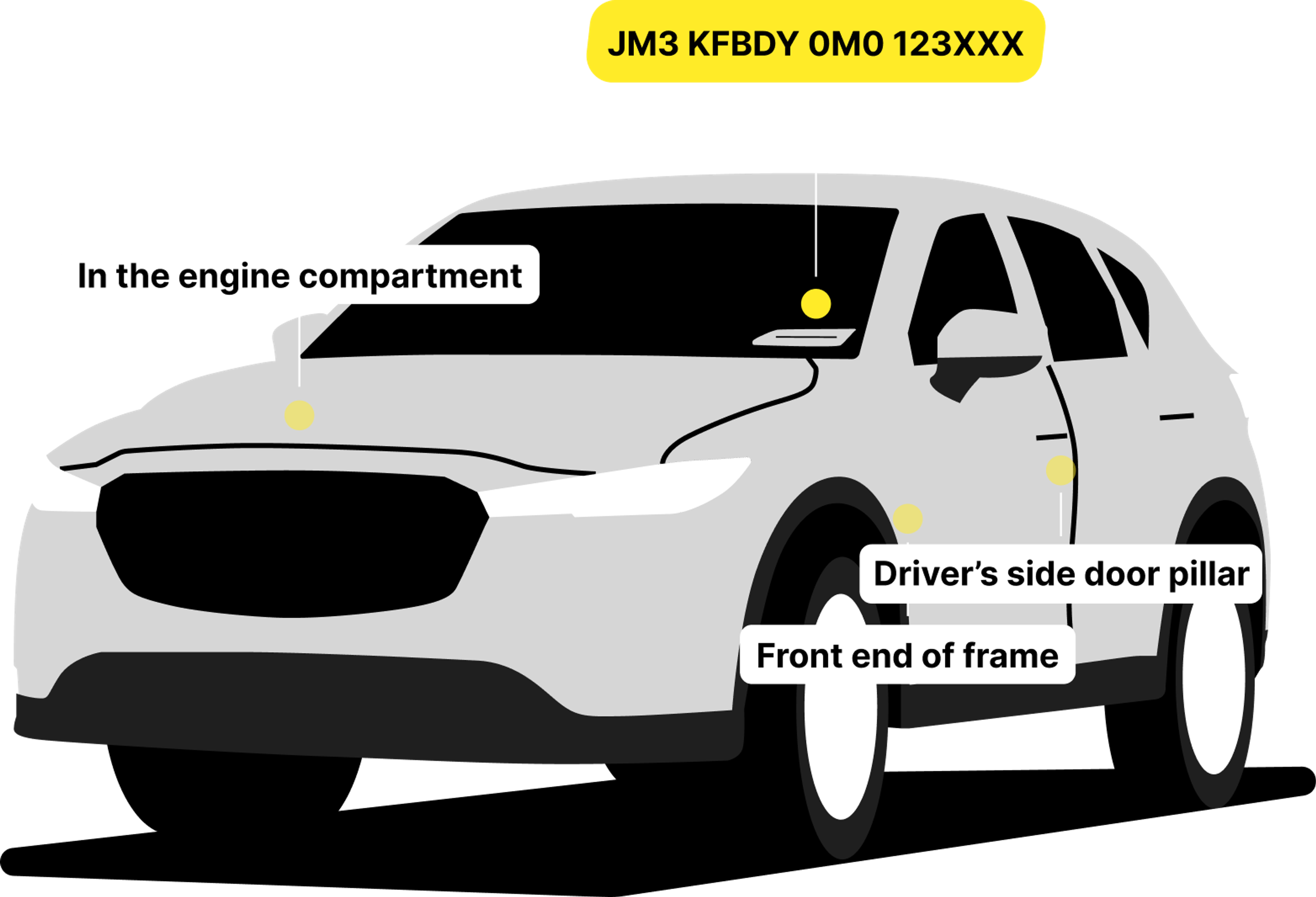 - Dashboard. Typically, you can find the Mazda VIN number engraved on a small metal plate or printed on a transparent sticker and placed on the dashboard. It should be visible through the windshield on the driver’s side of the vehicle.