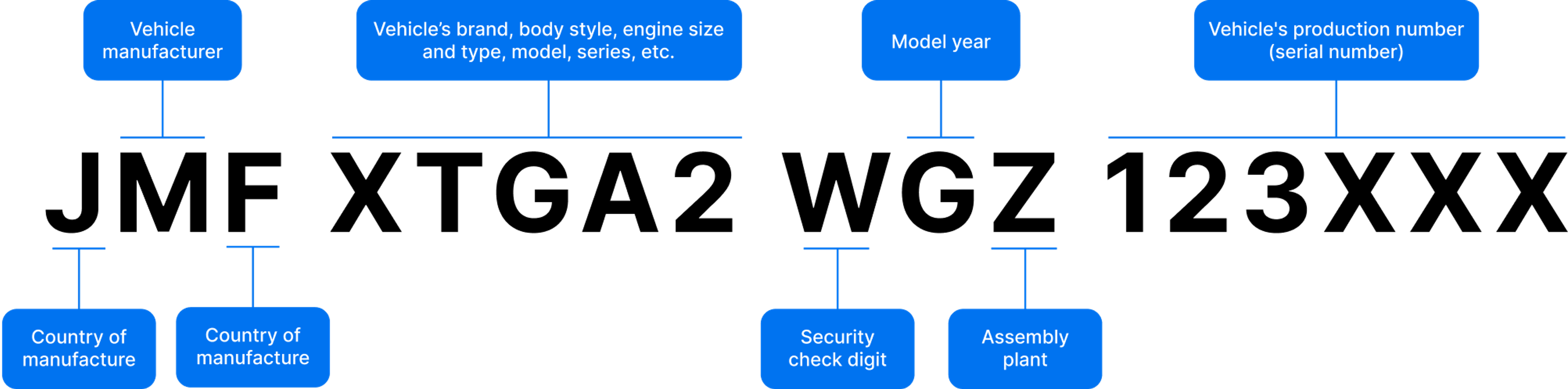 The World Manufacturer Identifier section is the first three characters of the VIN. Knowing what each of them means lets you learn about the country of origin, manufacturer, and vehicle type.