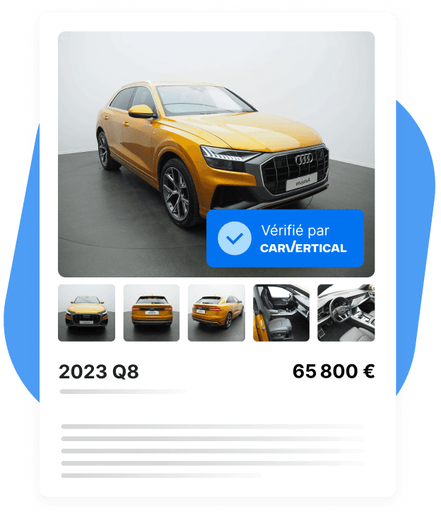 carVertical analyse plus d’un milliard de données pour vous aider à réduire les risques de mauvaises affaires, protéger vos marges et renforcer la crédibilité de vos annonces avec des preuves auxquelles les acheteurs peuvent se fier.