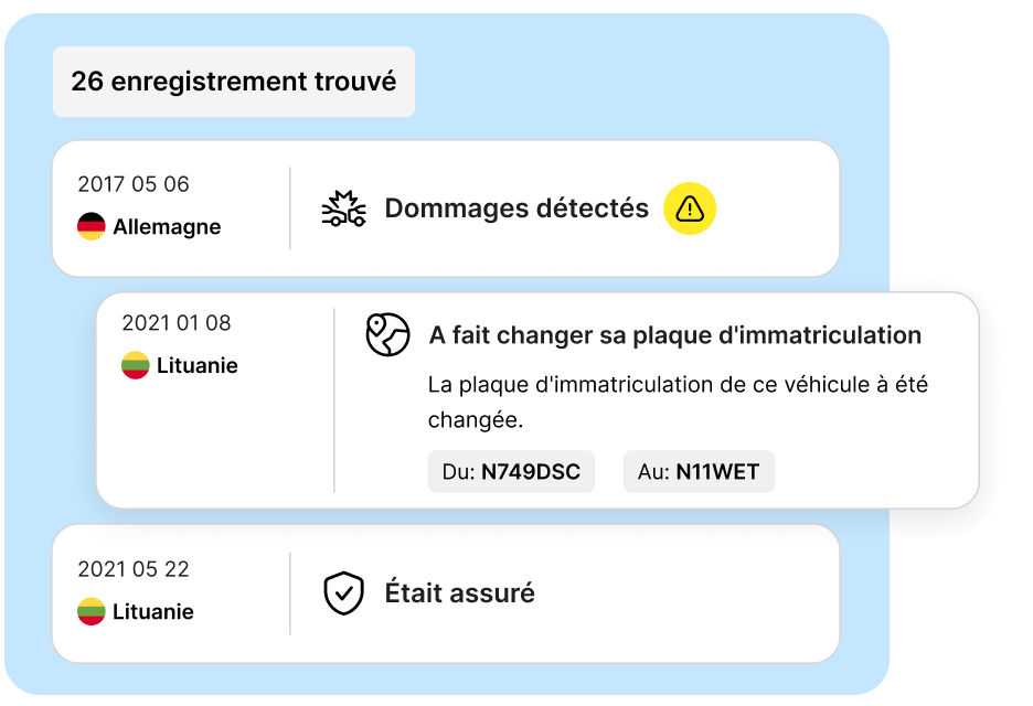 Avec les données de carVertical sur les dommages, nous vérifions plus de 330 millions d'enregistrements pour t'indiquer exactement où et quand un incident s'est produit, et combien les réparations pourraient te coûter (le cas échéant).