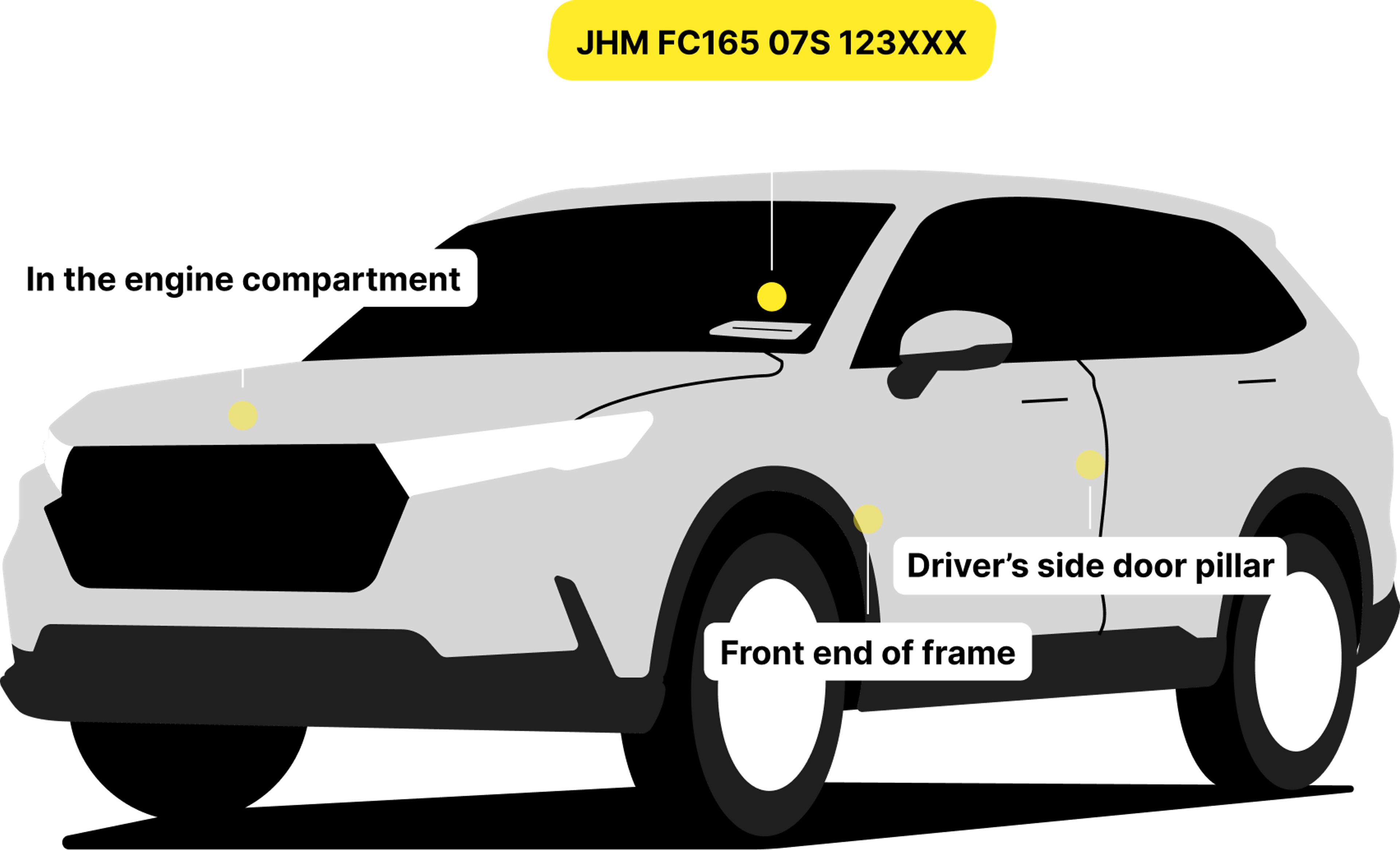 - The front end of a frame. Some Honda vehicles might have their VINs placed on the inner front wheel arch.