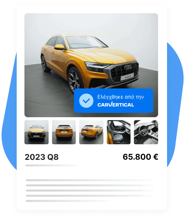 Η carVertical ελέγχει πάνω από ένα δισεκατομμύριο εγγραφές για να σας βοηθήσει να μειώσετε τον κίνδυνο κακών αγορών, να προστατεύσετε τα περιθώρια κέρδους σας και να υποστηρίξετε τις αγγελίες αυτοκινήτων σας με αποδείξεις που μπορούν να εμπιστευτούν οι αγοραστές.