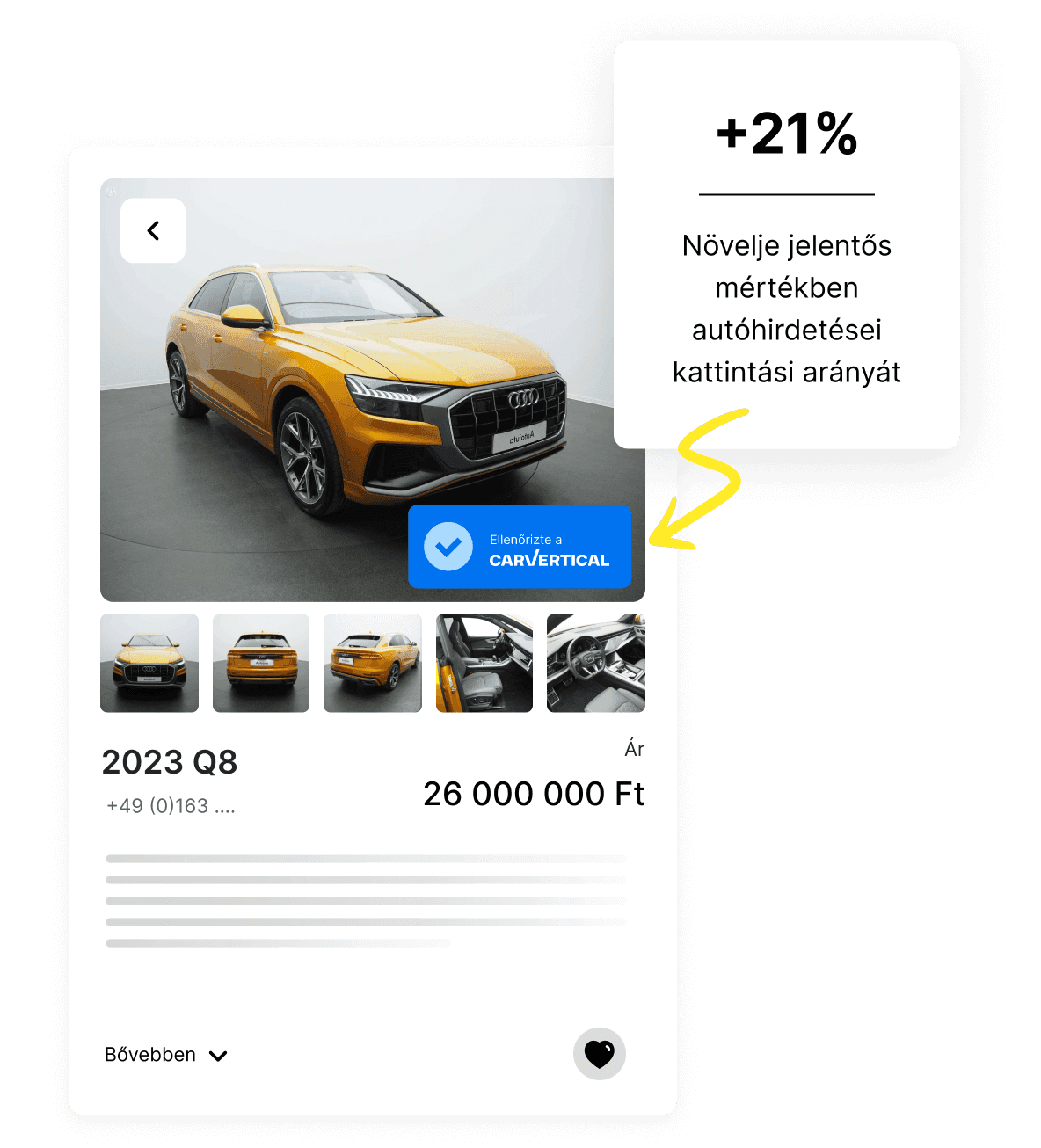 Legújabb kutatásunk szerint az emberek 21%-kal nagyobb valószínűséggel kattintanak a carVertical megbízhatósági jelvényével ellátott autóhirdetésekre, ami azt jelzi, hogy a jármű rendelkezik autótörténeti jelentéssel. A vízjel emellett kiemeli az autóhirdetéseket a többi hagyományos hirdetés közül.