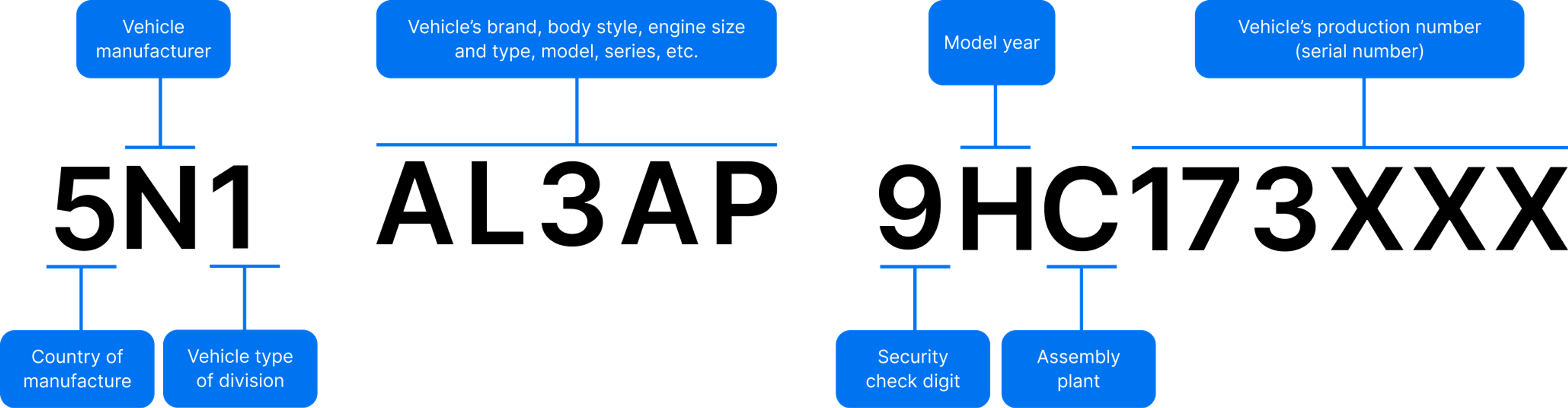 - Identificativo del produttore mondiale (WMI): i primi tre caratteri indicano il produttore e il luogo di fabbricazione. Per esempio, un VIN che inizia con "JN1" indica una Nissan prodotta in Giappone per il mercato europeo, mentre "5N1" è per i veicoli prodotti negli Stati Uniti.