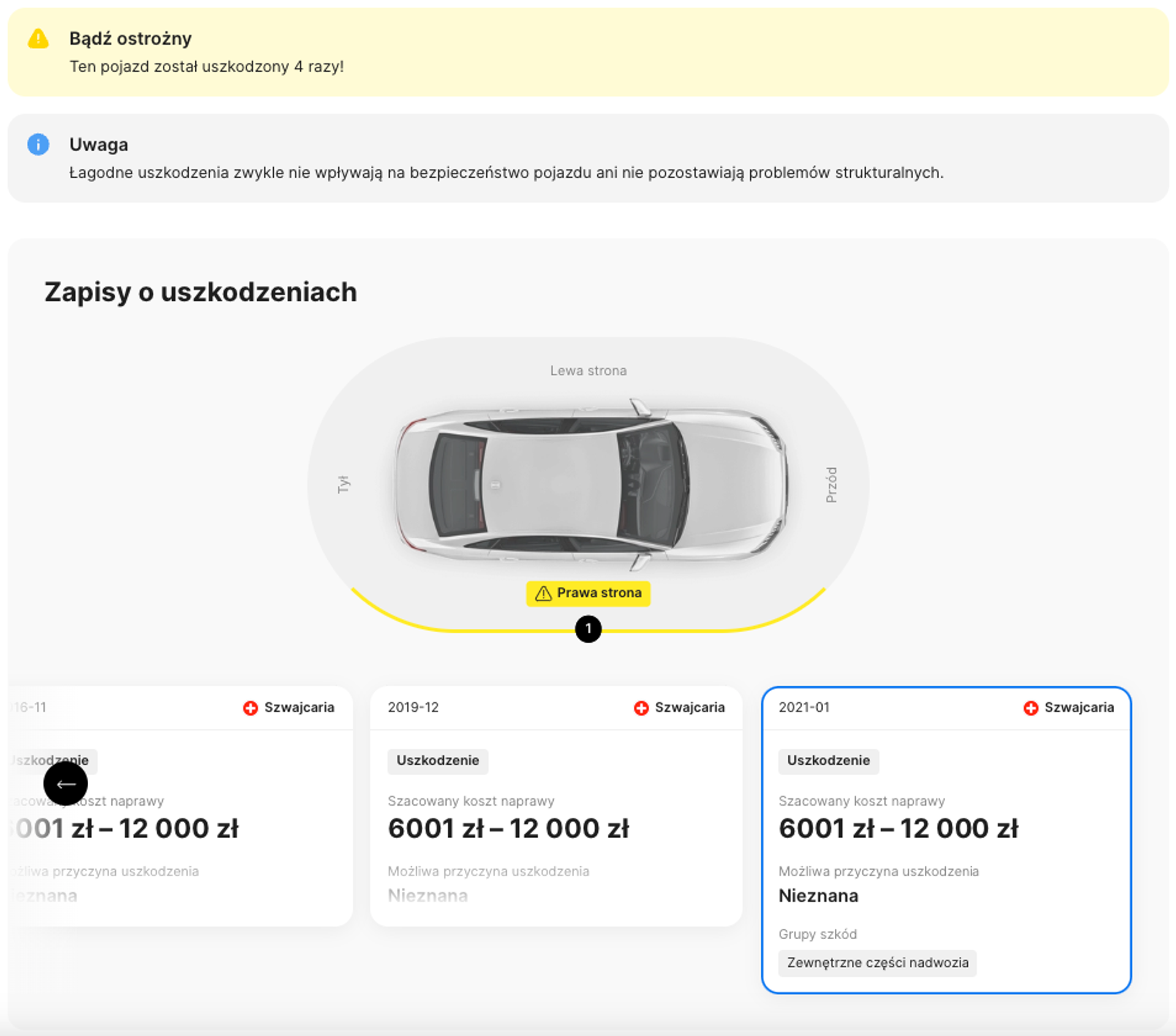 Raport historii pojazdu może pokazać, jak duże było uszkodzenie, która część auta ucierpiała, a nawet zawierać zdjęcia uszkodzonego pojazdu.