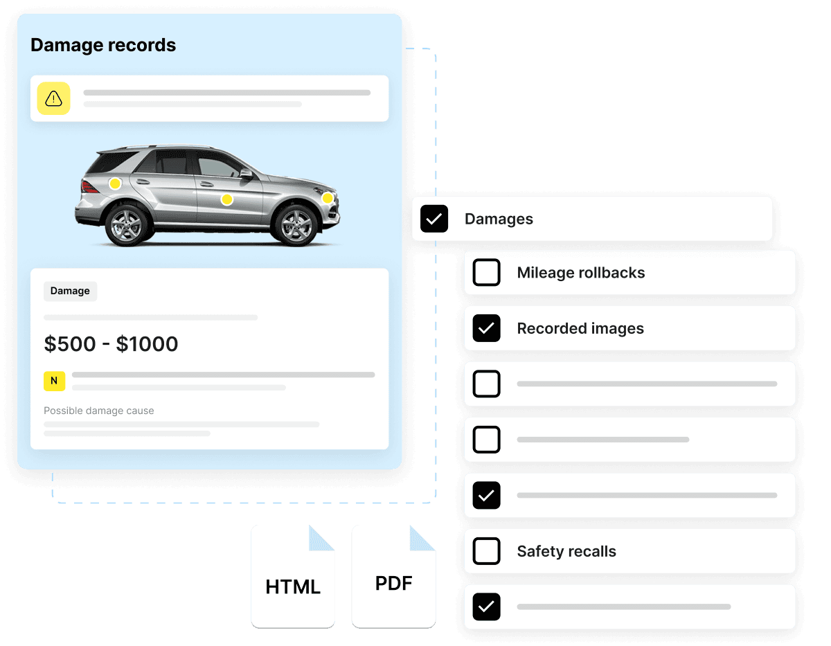 Nasze dostosowane rozwiązania API oferują szeroki wachlarz opcji personalizacji raportów historii pojazdów zgodnie z Twoimi preferencjami. Raport może być łatwo przedstawiony jako dynamiczna strona internetowa lub pobrany w formacie PDF o precyzyjnym układzie – dzięki czemu łatwo go przeglądać, udostępniać i analizować.