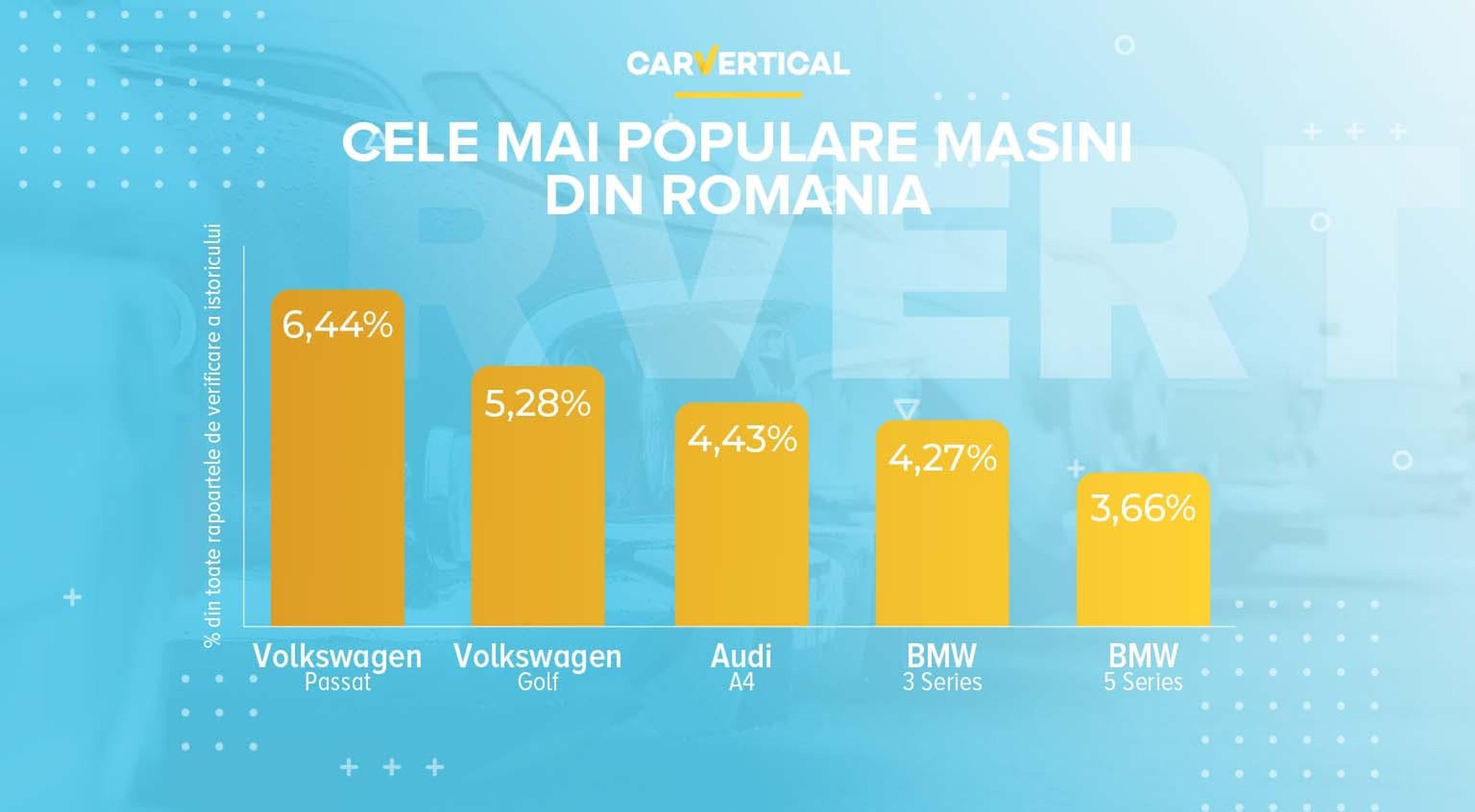 În acest context, carVertical a efectuat un studiu detaliat al rapoartelor generate în baza de date, alcătuind un top 5 al celor mai populare modele analizate pe site în România. Prin intermediul acestei platforme, persoanele interesate de o anumită mașină second-hand pot introduce seria de caroserie (VIN) a acesteia și afla informații valoroase, cum ar fi kilometrajul înregistrat oficial în service-uri autorizate și/sau în cadrul inspecțiilor periodice, posibilele daune și costurile de reparație, defecte comune, specificații detaliate (listă de echipamente în funcție de disponibilitatea acesteia) și multe altele.