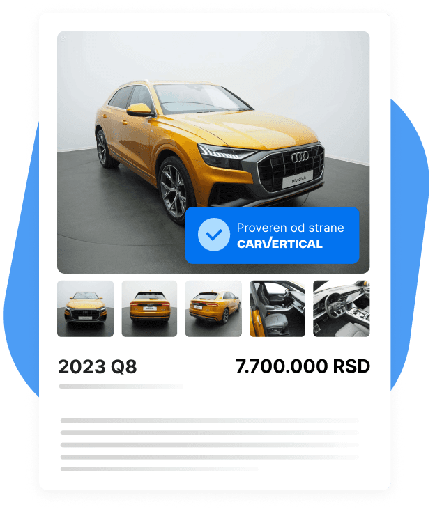 carVertical proverava preko milijardu podataka i pomaže vam da smanjite rizik loše kupovine, zaštitite zaradu i potkrepite oglase dokazima kojima kupci mogu verovati.